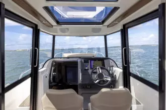C8 is a flexible and comfortable year-round commuter that works just as well whether you are traveling alone or with company. Despite the smaller size, we have prioritized space that makes it easy to get on or off and move onboard. The trick with the C8 was to build in the same high level of functionality and flexibility as the C9 but in a smaller hull, says Joacim Gustavsson, chief designer at Nimbus Boats Sweden AB. The foredeck of the boat offers a multi-functional space with seating that can be transformed into lounge, chill or drive mode depending on the situation. The light and spacious cockpit offers plenty of natural light thanks to its extra-large glass doors, the sliding glass roof hatch and the openable aft deck hatch. The boat can easily be transformed from closed to open within seconds. In addition to creating a light and open boat, the large aft glass hatch makes loading and unloading the boat easy and efficient plus it makes communication between the crew outside and inside smoother.