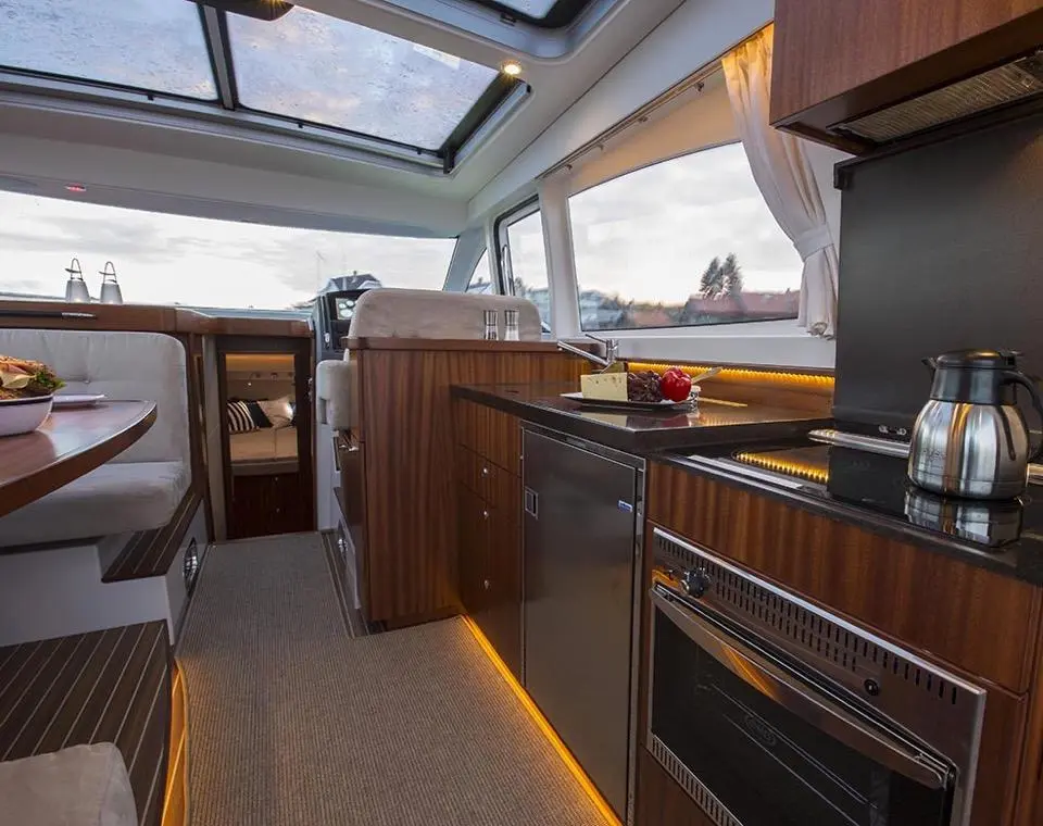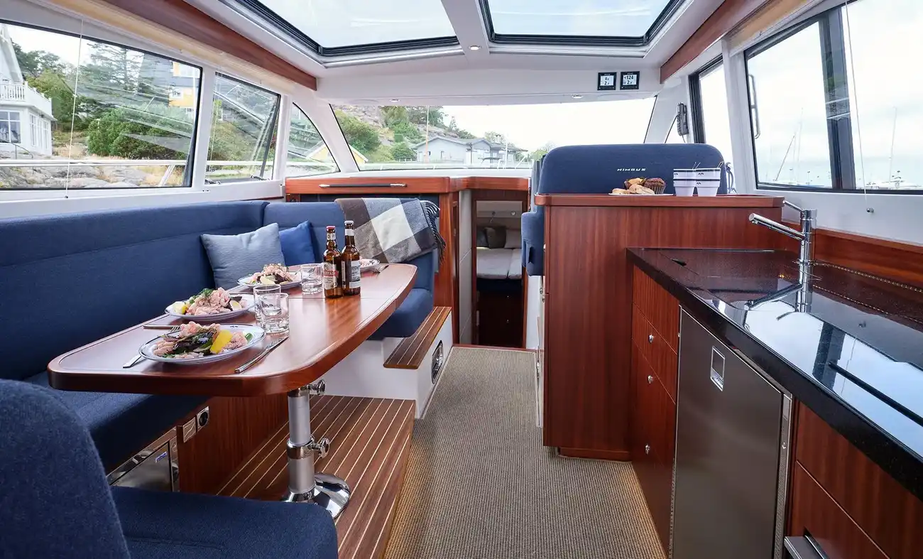 The boat has many similarities to her smaller sisters but offers several new features; Nimbus Design Team has added several interesting aesthetic and functionally integrated details. These include twin touch screens at the helm, room for five to ride facing front, a new D-pillar with integrated ventilation, fully glazed aft deck door, electric powered table on the aft deck and a “granny hatch” that conceals a main power plug on the stern. Other innovations include newly designed engine room ventilation in the hull sides with powered extractors, galley with ceramic gas hob and dark composite worktop, 120 litre capacity fridge plus extra cool storage in pull-out drawers beneath the salon sofa and much more.