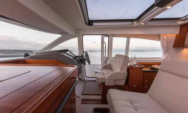 Maximum use is made of the interior volume, allowing the cockpit, salon, lower deck and cabin to be larger than would otherwise be the case in a boat of this size. An important feature of the Nimbus sidewalk concept is the large flush fitted sliding door to starboard. The sliding door provides quick access when laying alongside and enables the captain to maneuver the boat from a standing position on the side deck. The sidewalk concept also allows the use of the aft deck for various activities. And on the foredeck, the extra space is used to integrate a large sun deck as a natural feature of the boat’s design.