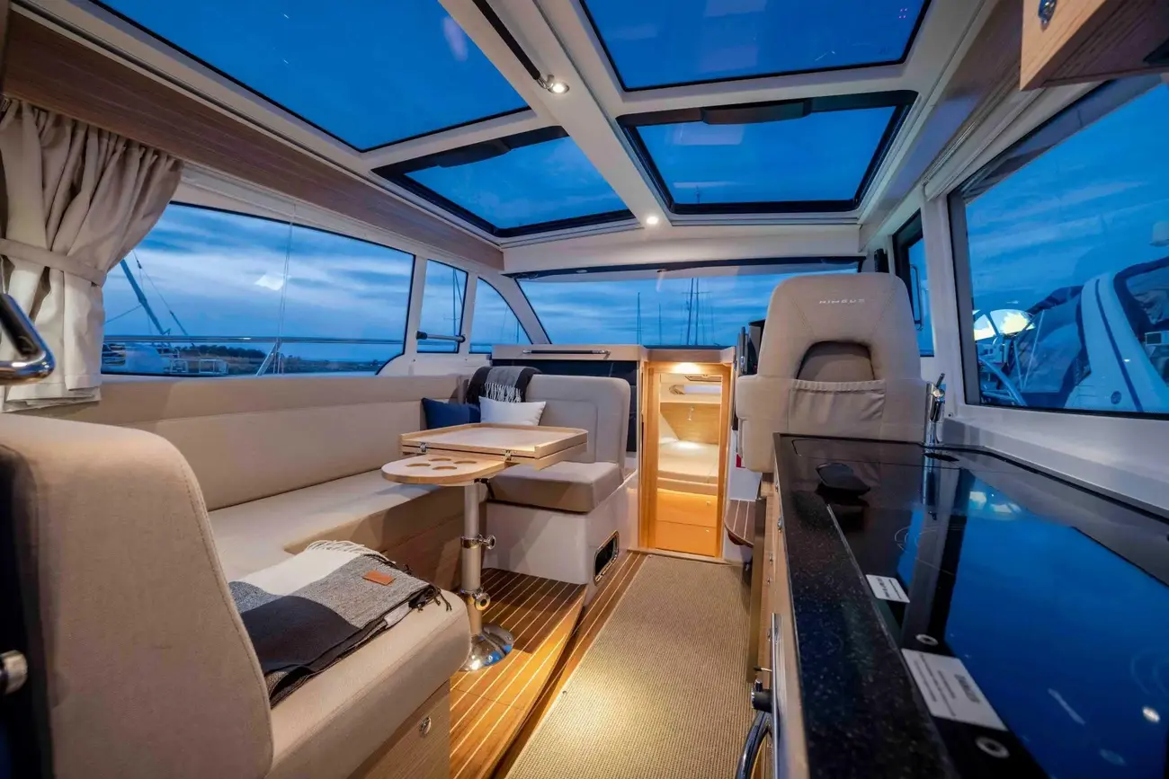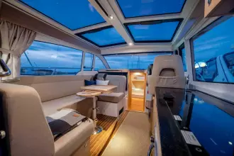 Examples of this functional and improved design are a stronger bumper list, improved visibility from the helm position and salon, a new D-pillar with integrated ventilation, double sunroofs giving more natural light in the salon, an extended aft roof for better shelter and easier canopy handling, a new, improved side door and redesigned pulpits with improved functionality and safety.