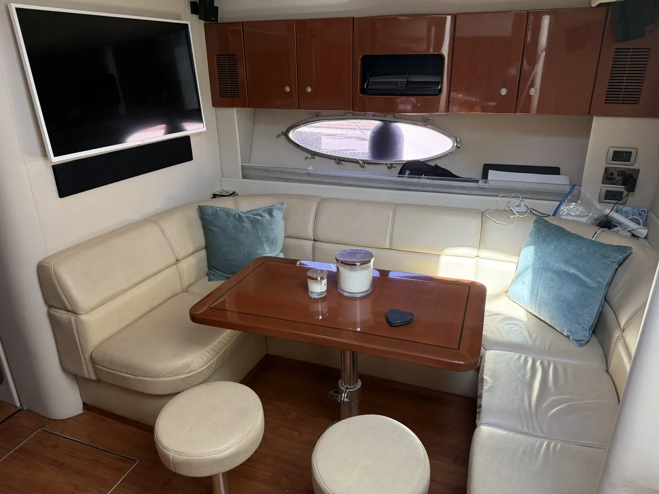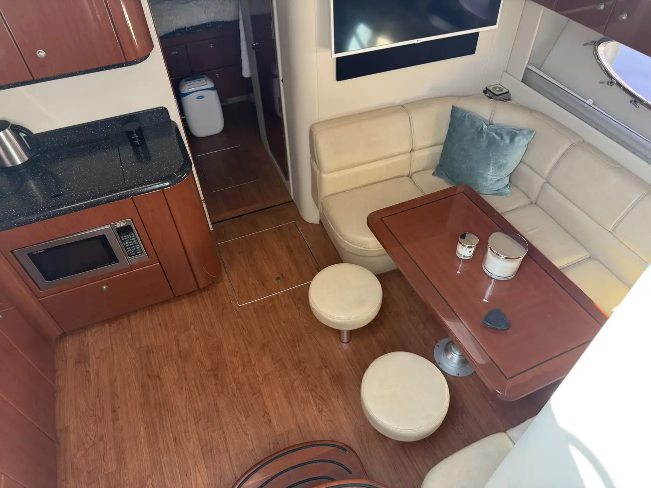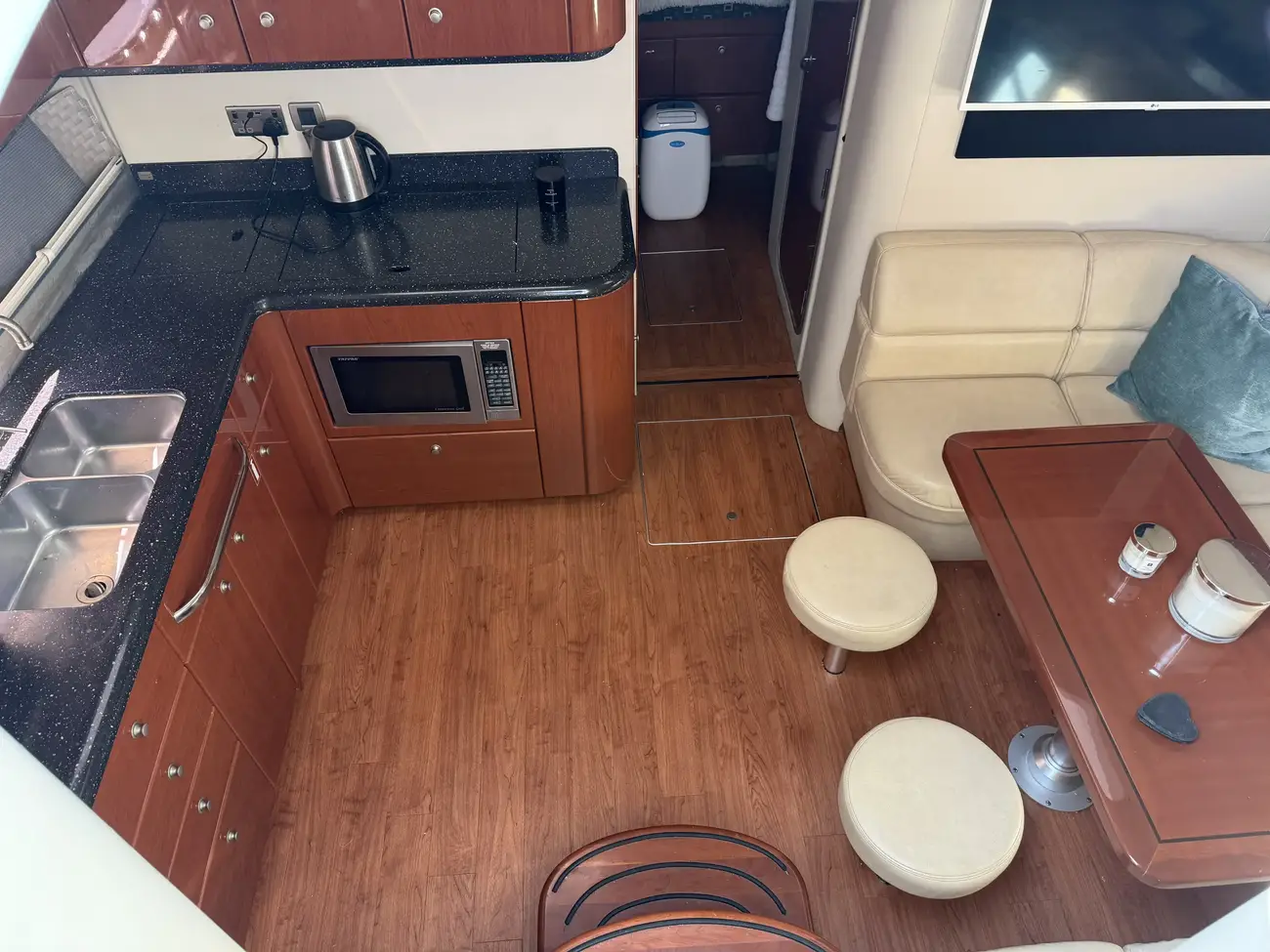 Large saloon with u shaped bench seating (coverts to lounging area/double berth) and port galley.