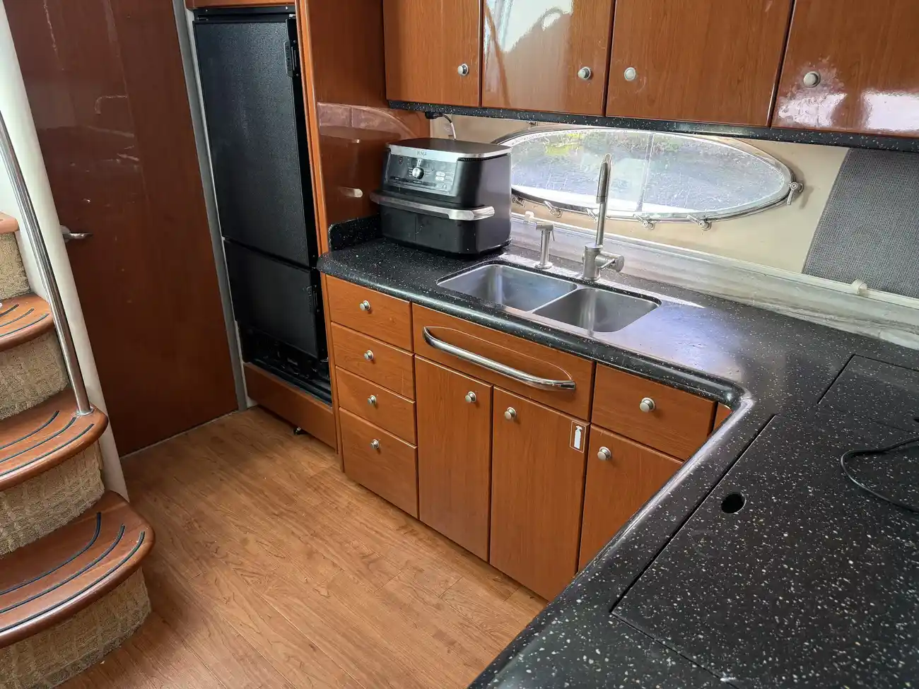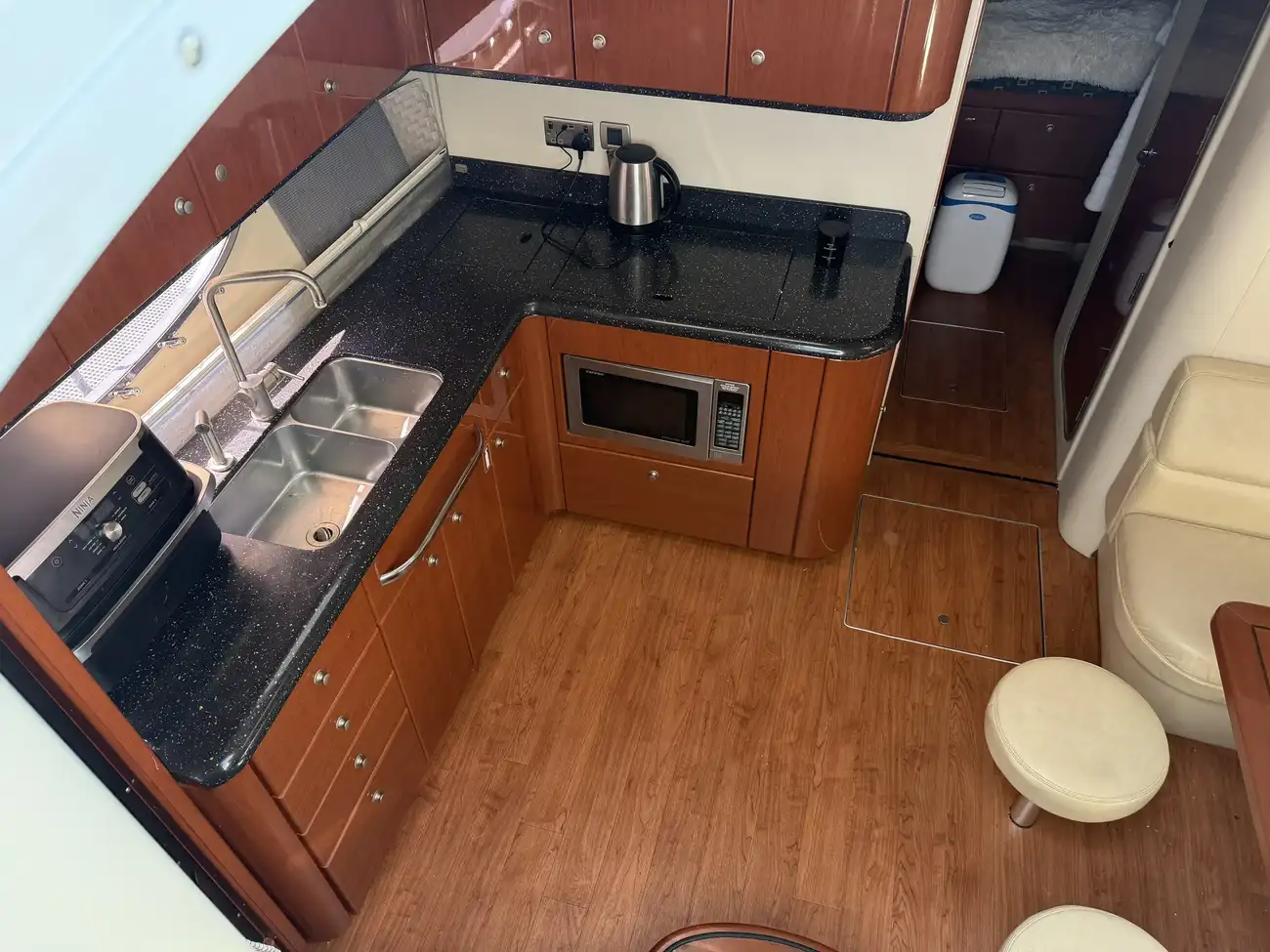 Galley area with American style fridge/Freezer, double sink with hot and cold water, induction plate with two rings, Microwave/oven and wine cooler.