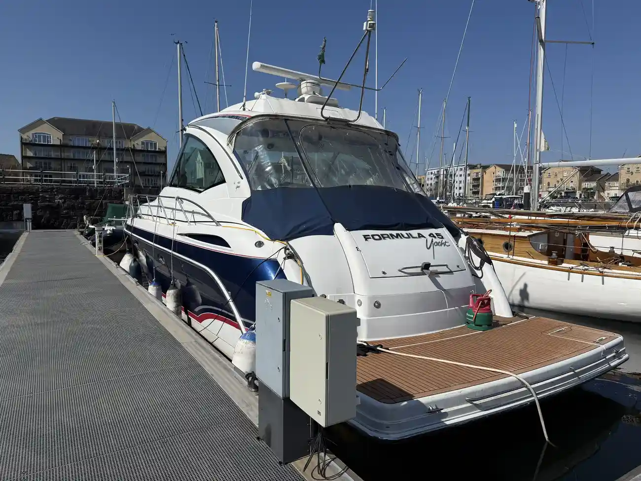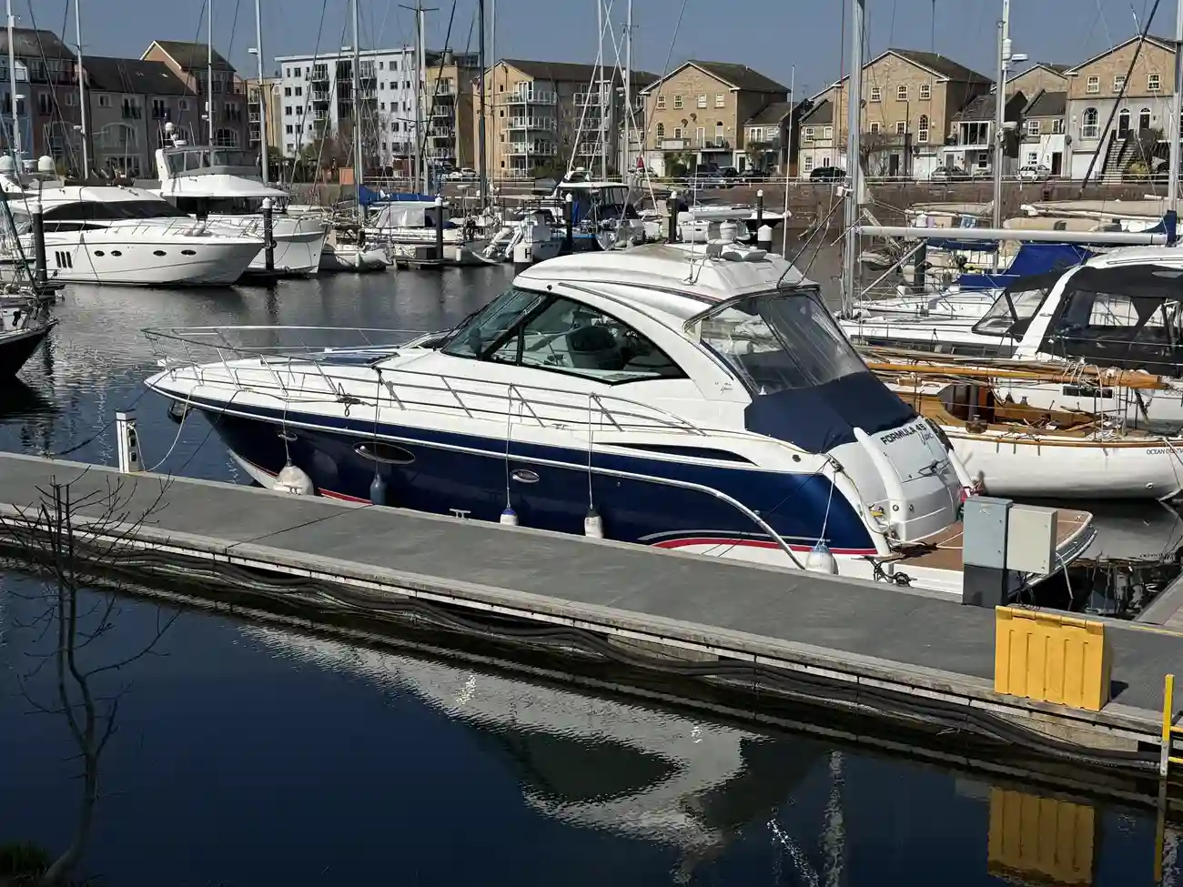 Formula 45 from 2008 with twin D6 435hp each and IPS pod drives with full access direct to the engine compartment from the rear cockpit. This is a one owner boat from new and is in good condition with only 827 hours from new. The accommodation comprises of a forward double berth with separate en-suit and shower facilities. The aft cabin offers twin berths with its own heads compartment and a basin in the cabin. The lower saloon has a wrap around dinette and an L shaped galley opposite which houses a large fridge/freezer as well as the usual cooking facilities. Steps lead back up to a spacious cockpit with a twin helm seat and a sun lounging area opposite, behind is another wrap around dinette area with a fridge, sink and grill top opposite. Aft of the cockpit is a large bathing platform larger enough for the right toys. On the forward is a double sunbathing area accessed from the front windscreen.