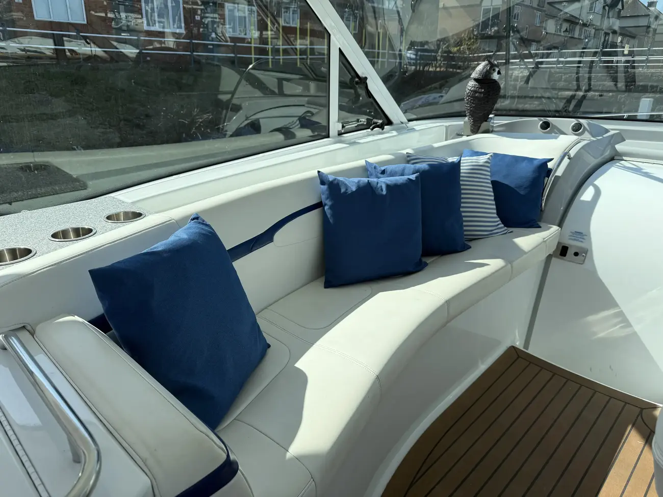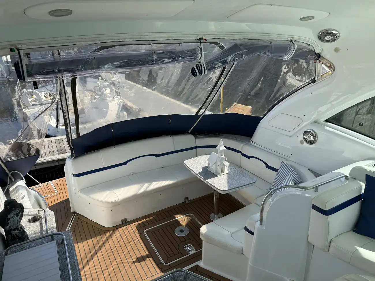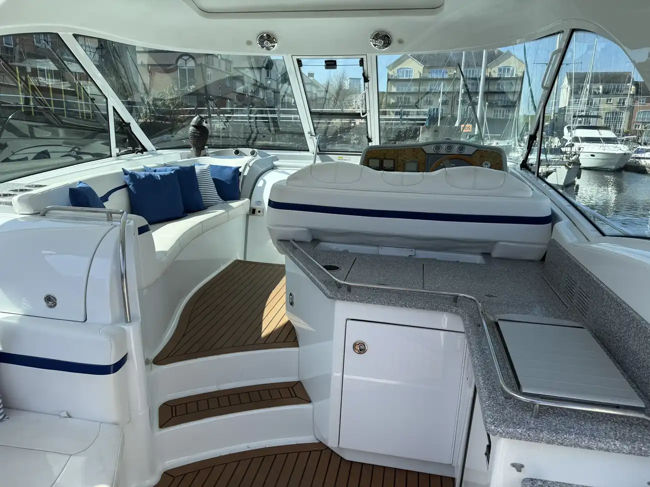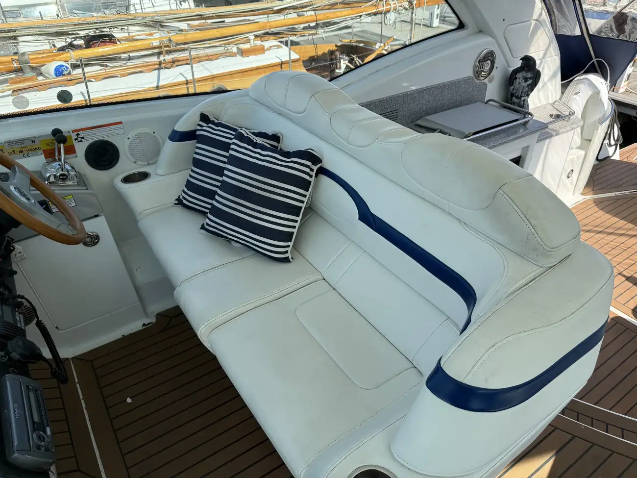 Cockpit with starboard large helm bench seat.