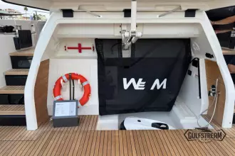 Inside, the design is refined and contemporary, combining light lacquered finishes with warm teak and carefully considered lighting. The atmosphere is bright, welcoming, and undeniably stylish – more like a luxury residence than a yacht. The saloon is open and airy, with excellent sightlines and space for entertaining, while below deck you’ll find beautifully appointed private cabins. The layout delivers exceptional comfort for extended cruising, with a full-beam master suite, generous guest cabins, and a separate crew area, ensuring that every guest enjoys privacy and space.