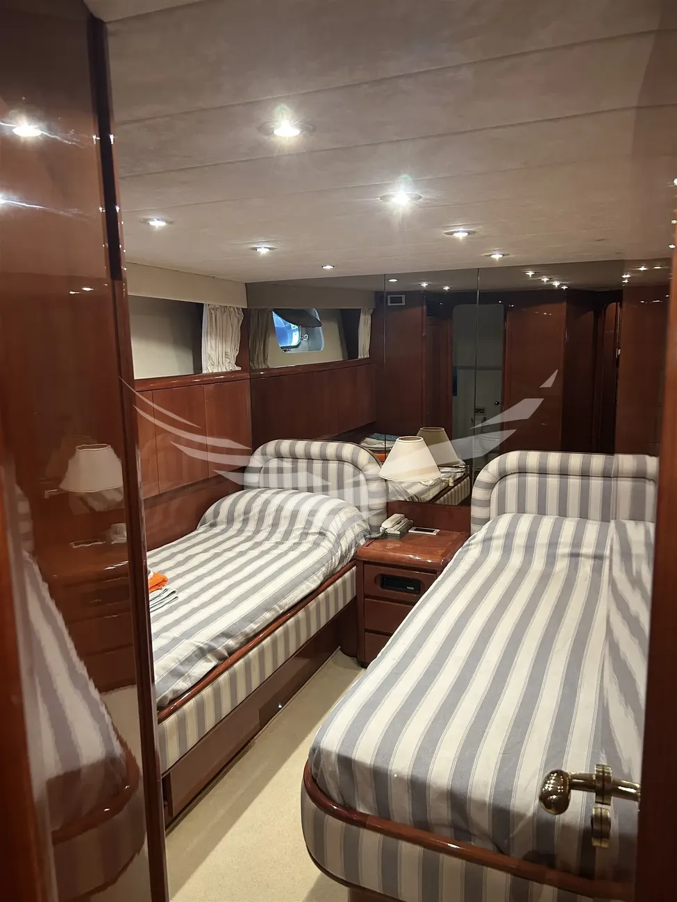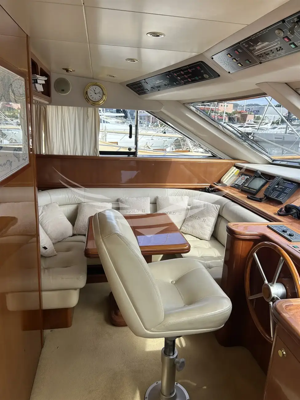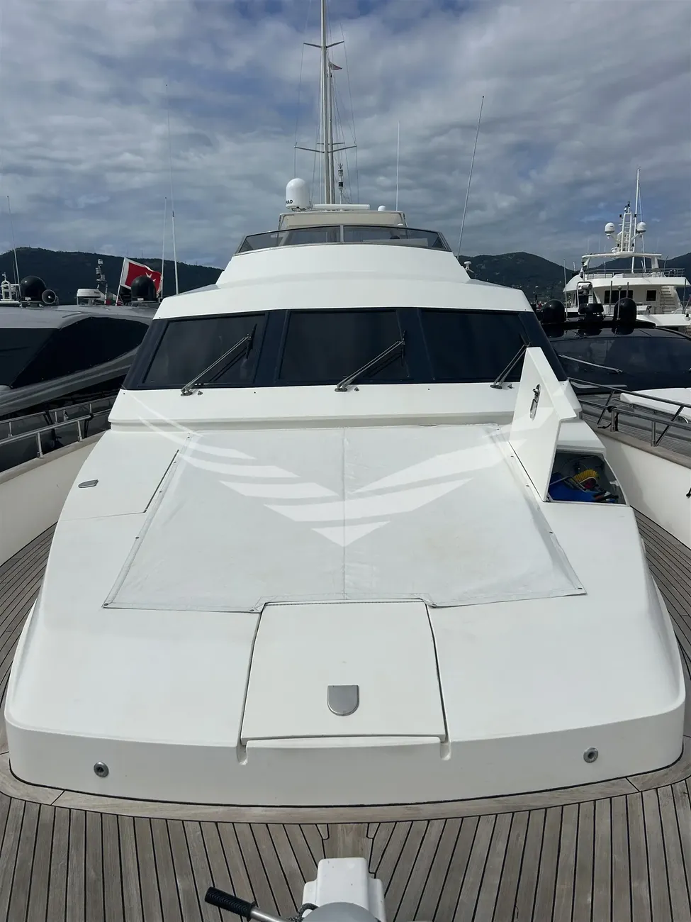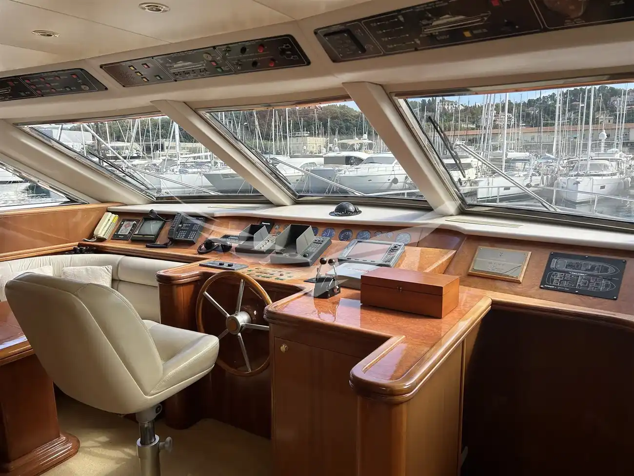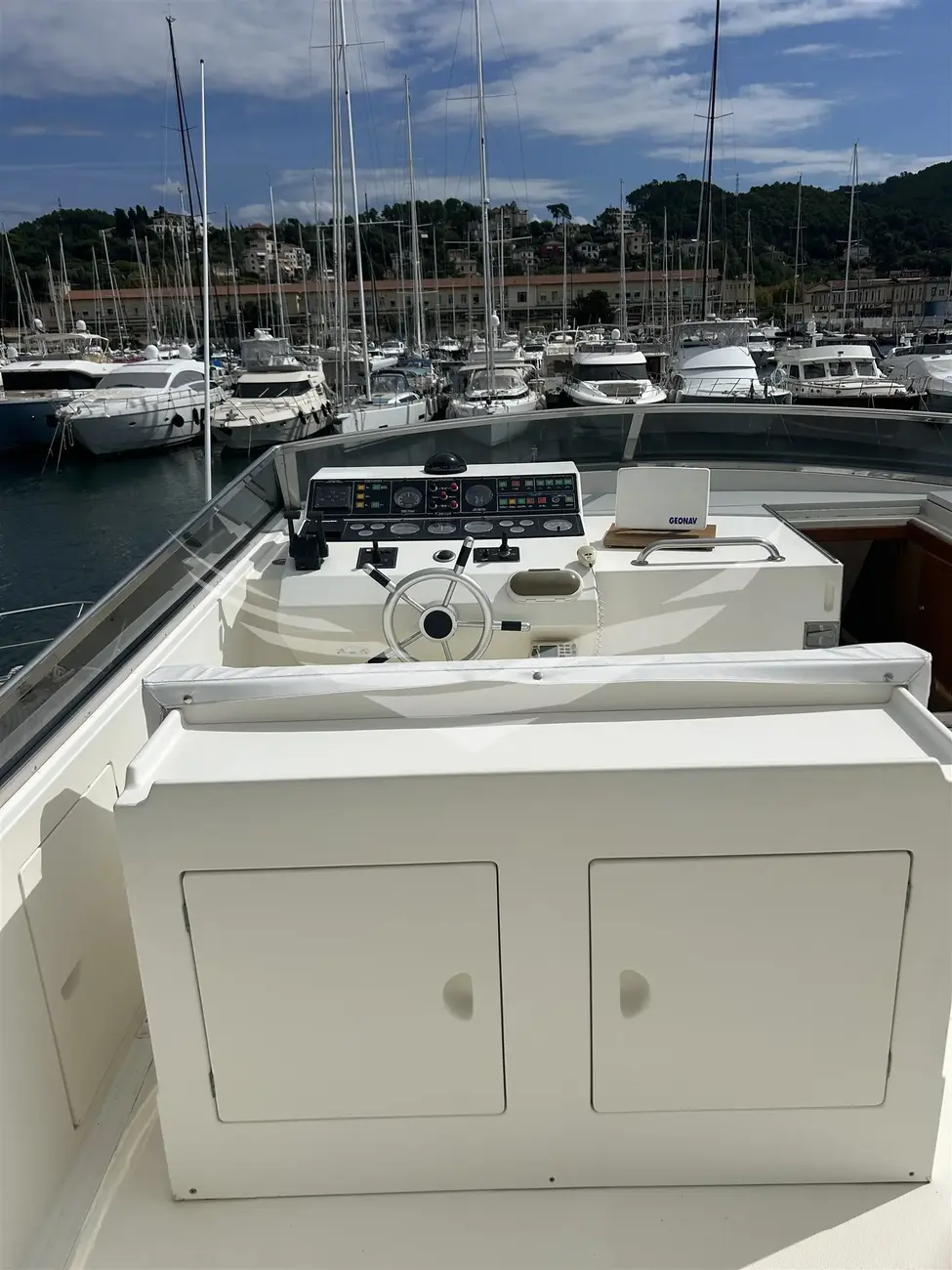 Jobs performed: Cockpit table replaced in 2025 Seat replaced in 2025 Fire prevention system overhaul 2024 Carpet completely renovated in salome in 2024 Cushions completely renovated in the saloon in 2024 Replaced fly sun awning in 2024 Teak platform + stern steps renovated in 2023 WC Review 2023 All bilge pumps replaced and new clarinet nek 2023 inserted 2 generator sets overhauled in 2022 2 refrigerators added in the kitchen in 2022 Engine exchangers replaced in 2021 Navigation equipment: 2 Compass ((1 in plancia + 1 sul fly)), Depth Sounder (Raymarine), 2 GPS (Lorenz a colori (1 in plancia + 1 sul fly)), Autopilot (Navicontrol), Radar (Furuno 72 mg), 2 VHF Radio (1 in plancia + 1 sul Fly). Staging and technical: cockpit table, Tender (AB motore Honda 20Hp). Domestic Facilities onboard: Watermaker (100/h). Entertainment: Satellite TV antenna (Simrad), TV (panasonic 42" nuova 2024). Kitchen and appliances: 2 Refrigerator (2022). Upholstery: Sunshade (sul fly).