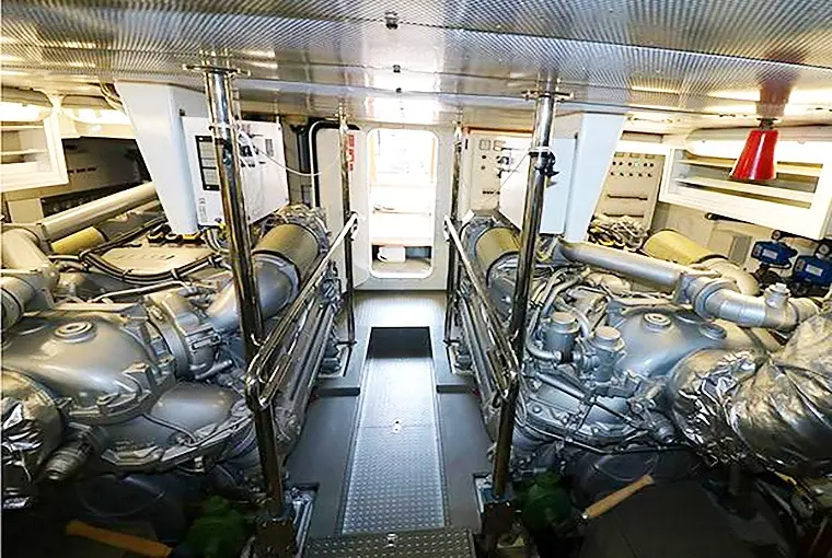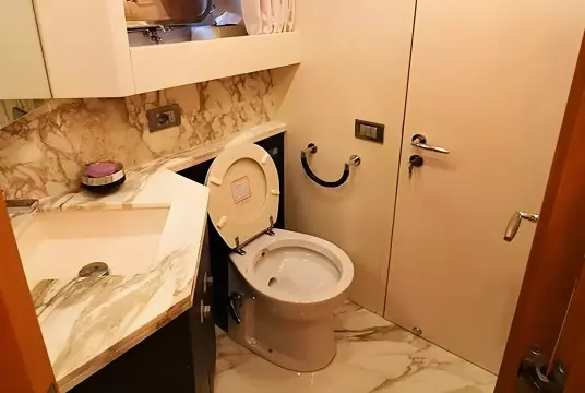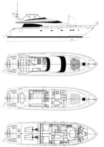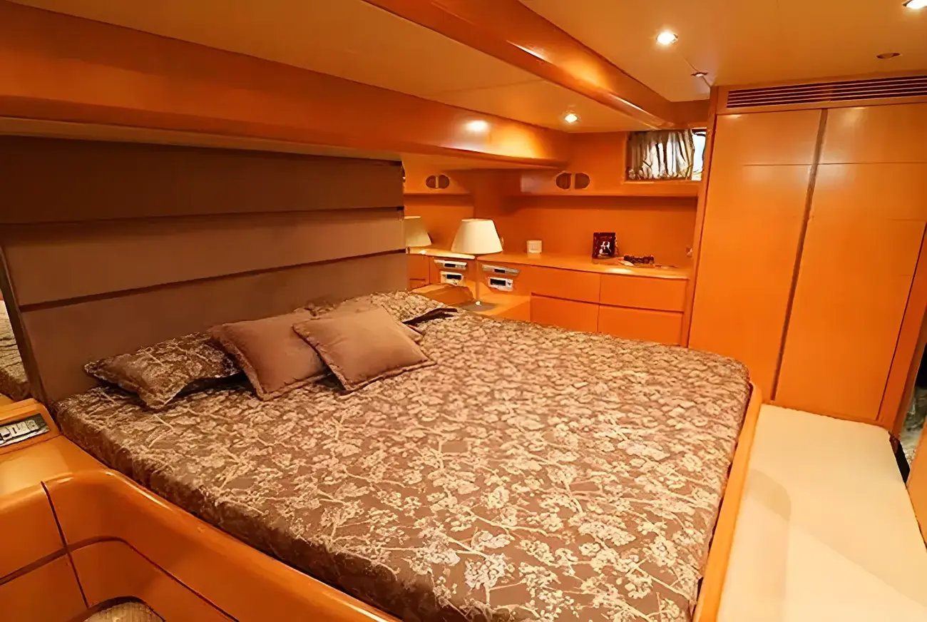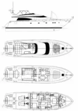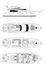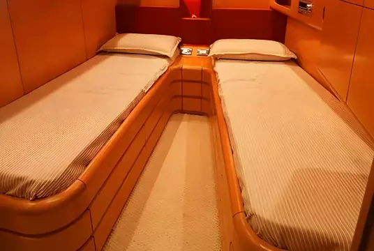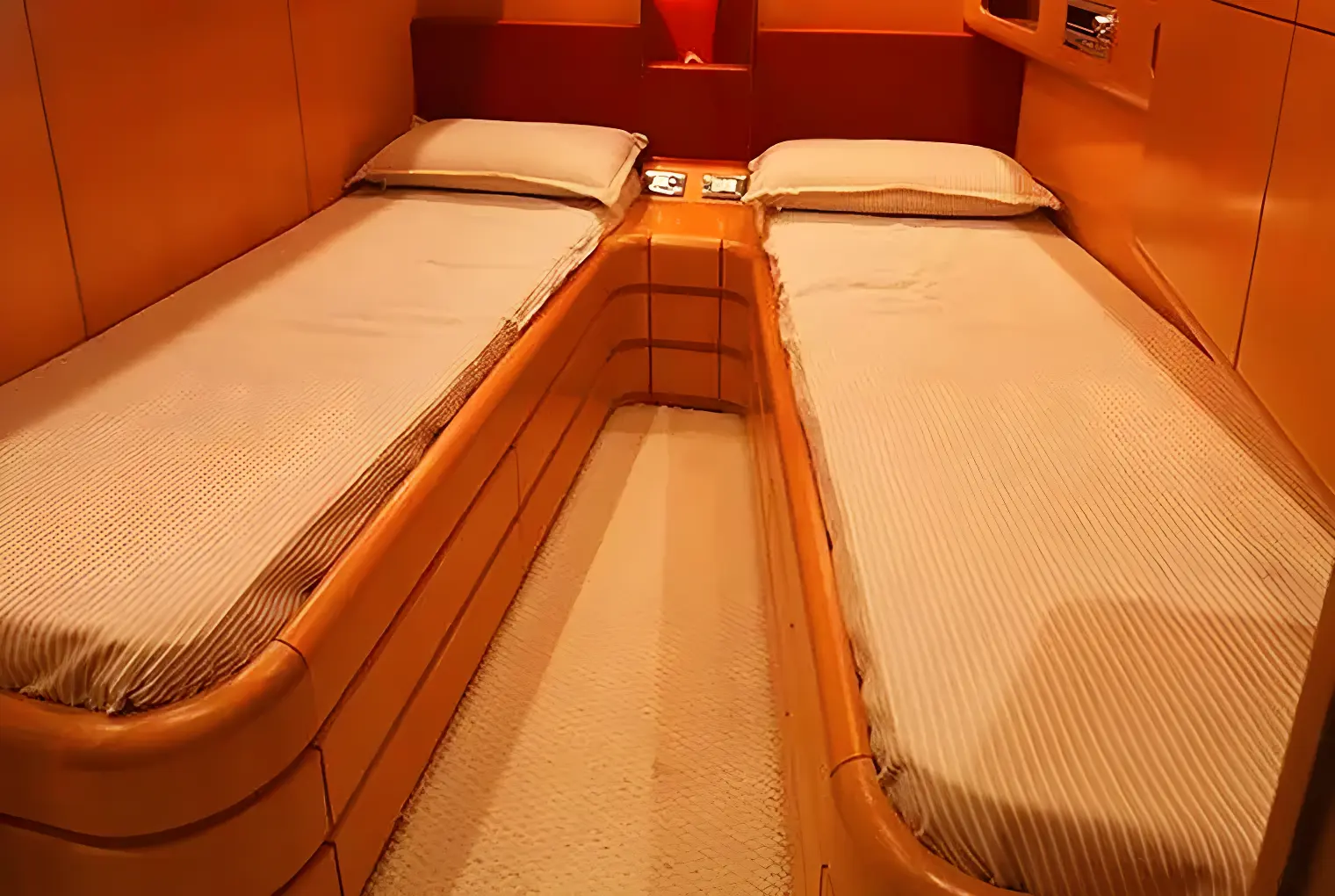 4 cabins layout + 3 toilets: aft master cabin, forward VIP cabin and two guest cabins. Crew cabin at bow with two berths.