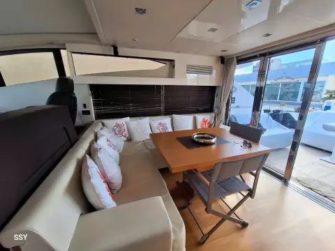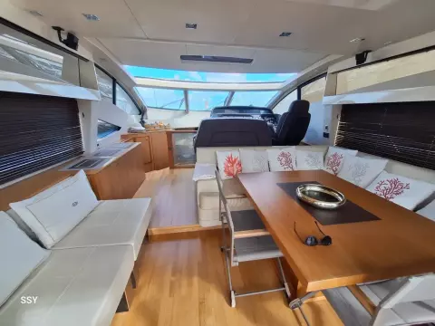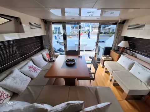 The spacious and bright main salon, finished with premium materials, features an elegant living area with leather sofas and a central telescopic table. On the opposite side, a dedicated cabinet houses a Sony 40” TV, Bose Lifestyle sound system, Alpine Multi CD/MP3 player, and HD satellite decoder.