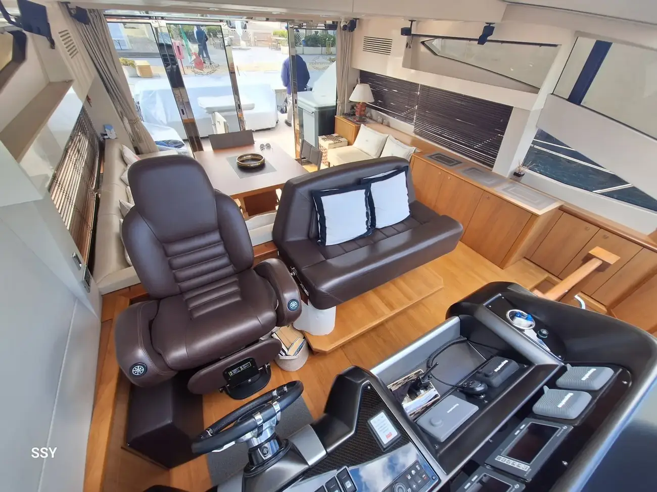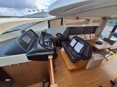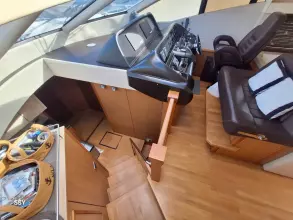 The helm station is equipped with an electric Besenzoni pilot seat, complemented by a comfortable co-pilot settee.