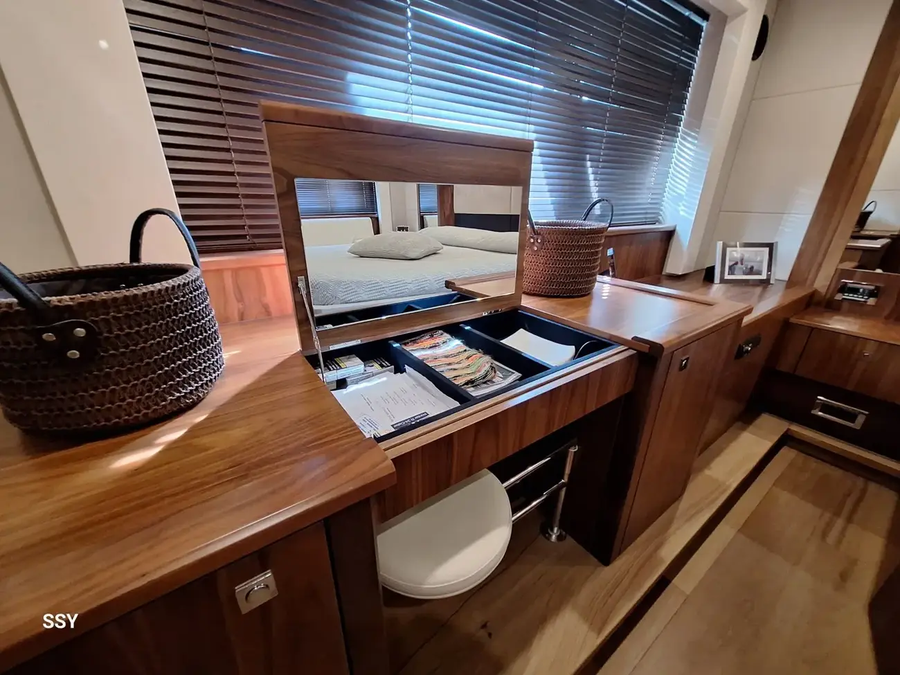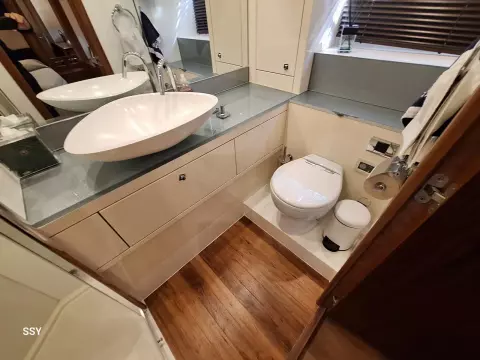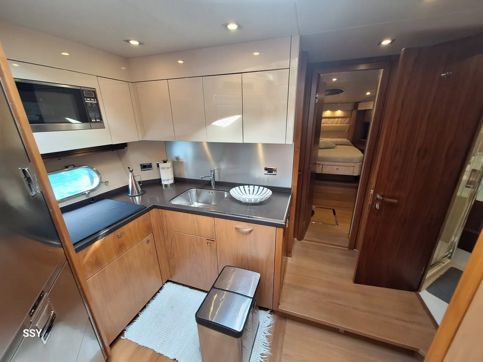 The galley, located below deck and accessed via two steps, is fully equipped and finished with fine wood and stainless-steel accents. It includes a Bosch cooktop, Sharp digital oven, Bosch dishwasher, and a full-height Vitrifrigo refrigerator/freezer.