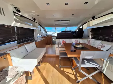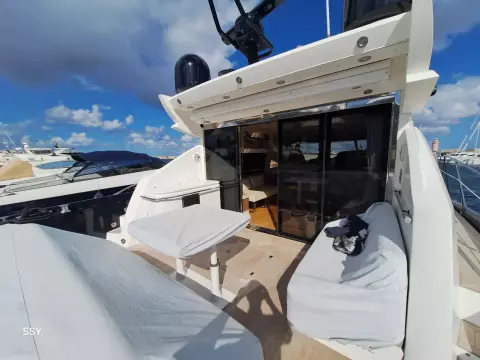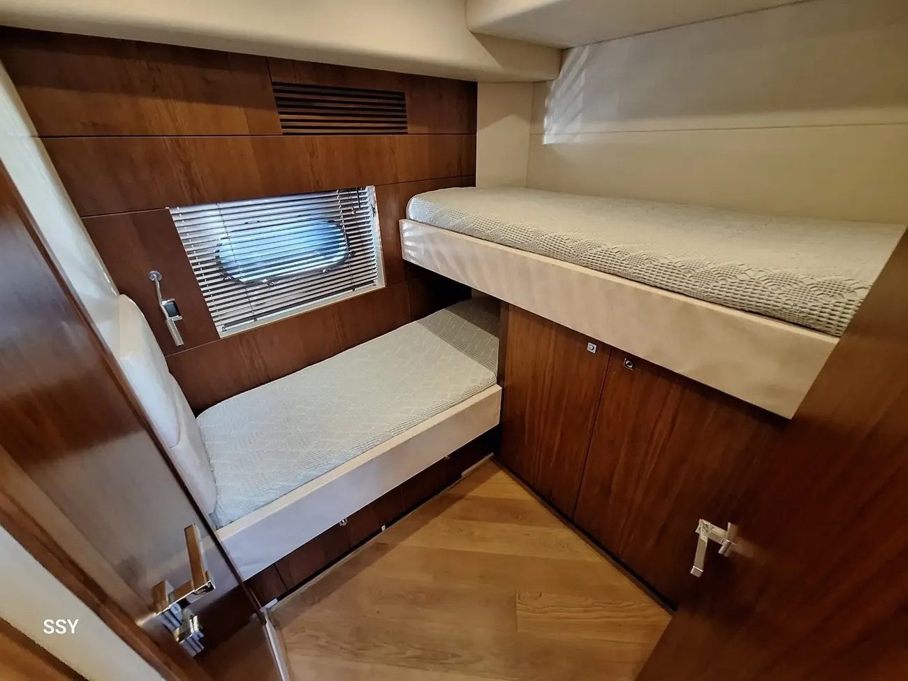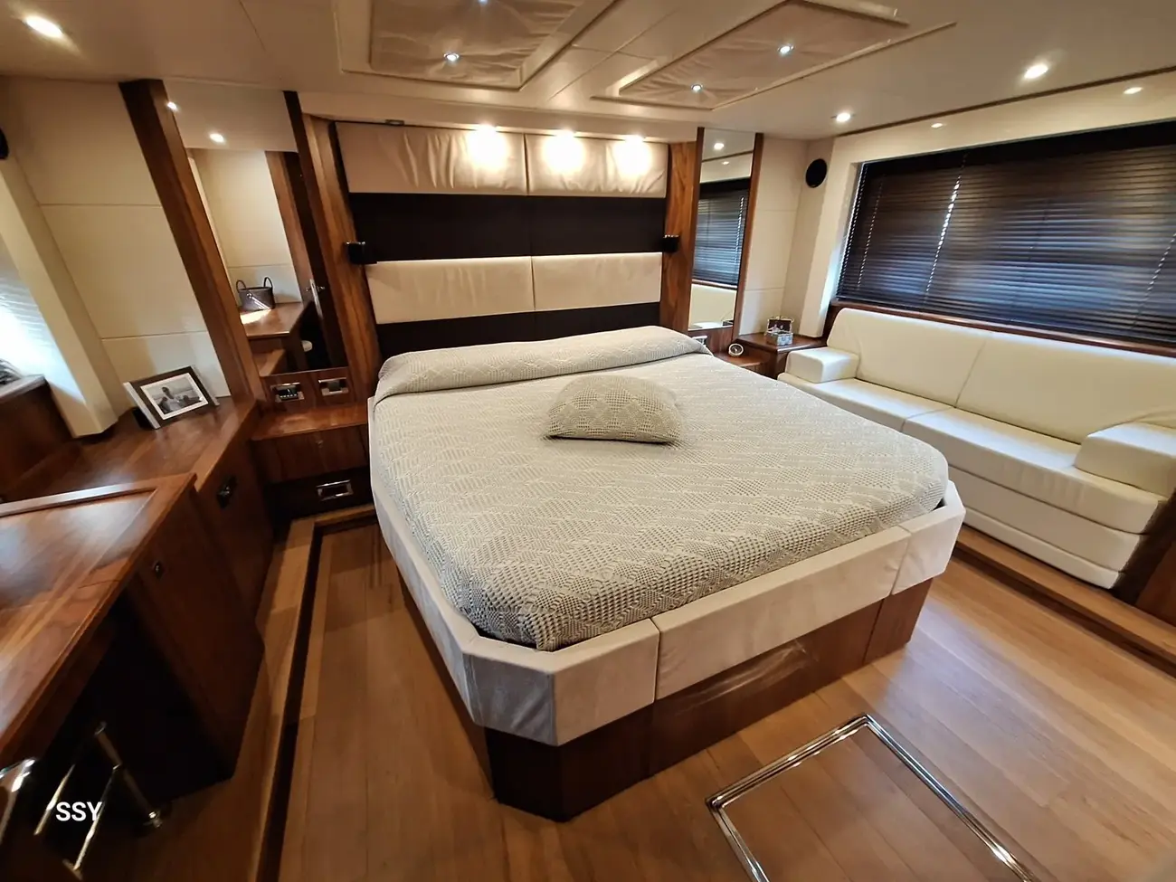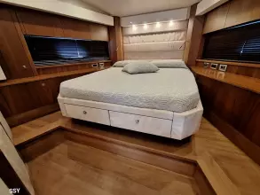 BLU MILLA III is an elegant 2009 Sunseeker Predator 64, featuring a stunning midnight blue hull, teak-laid main deck, and refined Tanganika walnut interiors, enhanced by wooden parquet flooring throughout both the day and night areas, leather sofas, and wooden venetian blinds in every cabin and living space.