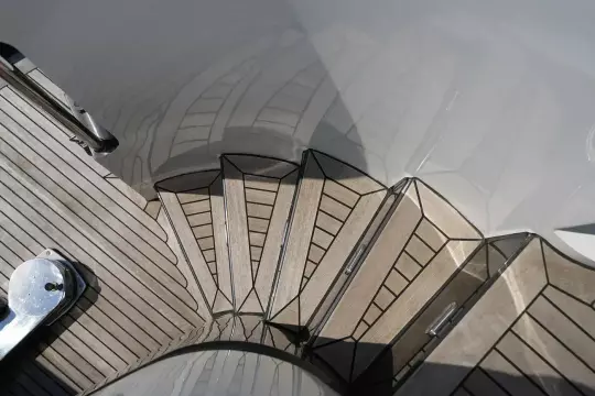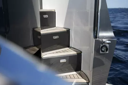 Hydraulische gangway (Opacmare 8998/25) in hoogglans gepolijst rvs 316, uitschuifbaar tot 2,45 m met handrailing en teak loopvlak. Met een hefcapaciteit van 450 kg functioneert deze ook als bijbootkraan.