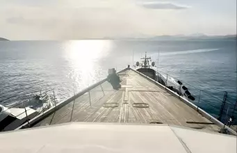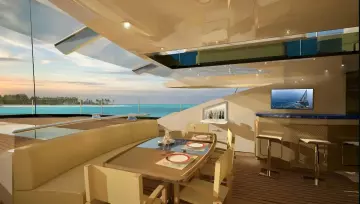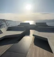 The exterior is elegantly contemporary, yet rugged and aggressive. A stunning glass-paneling feature, which runs from the private aft-deck through the centerline of the yacht to the helm station, allowing sunlight to filter into the interior, illuminating the onboard living spaces.