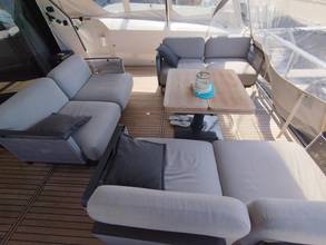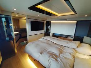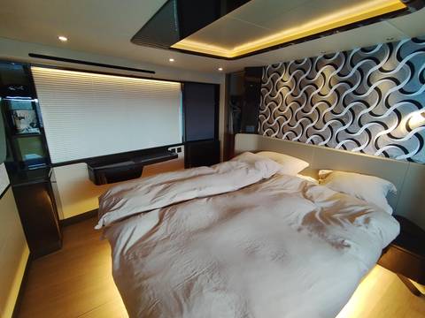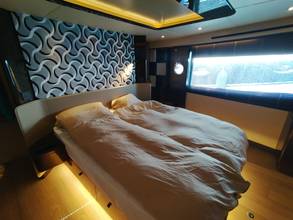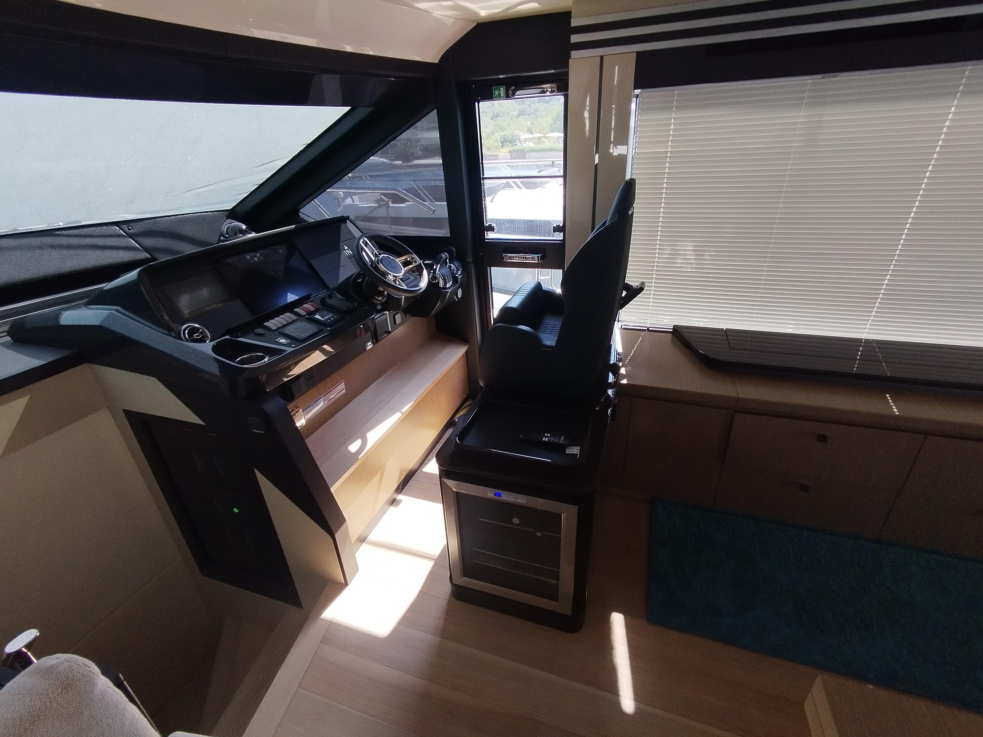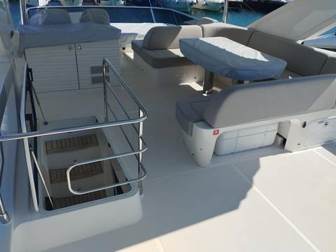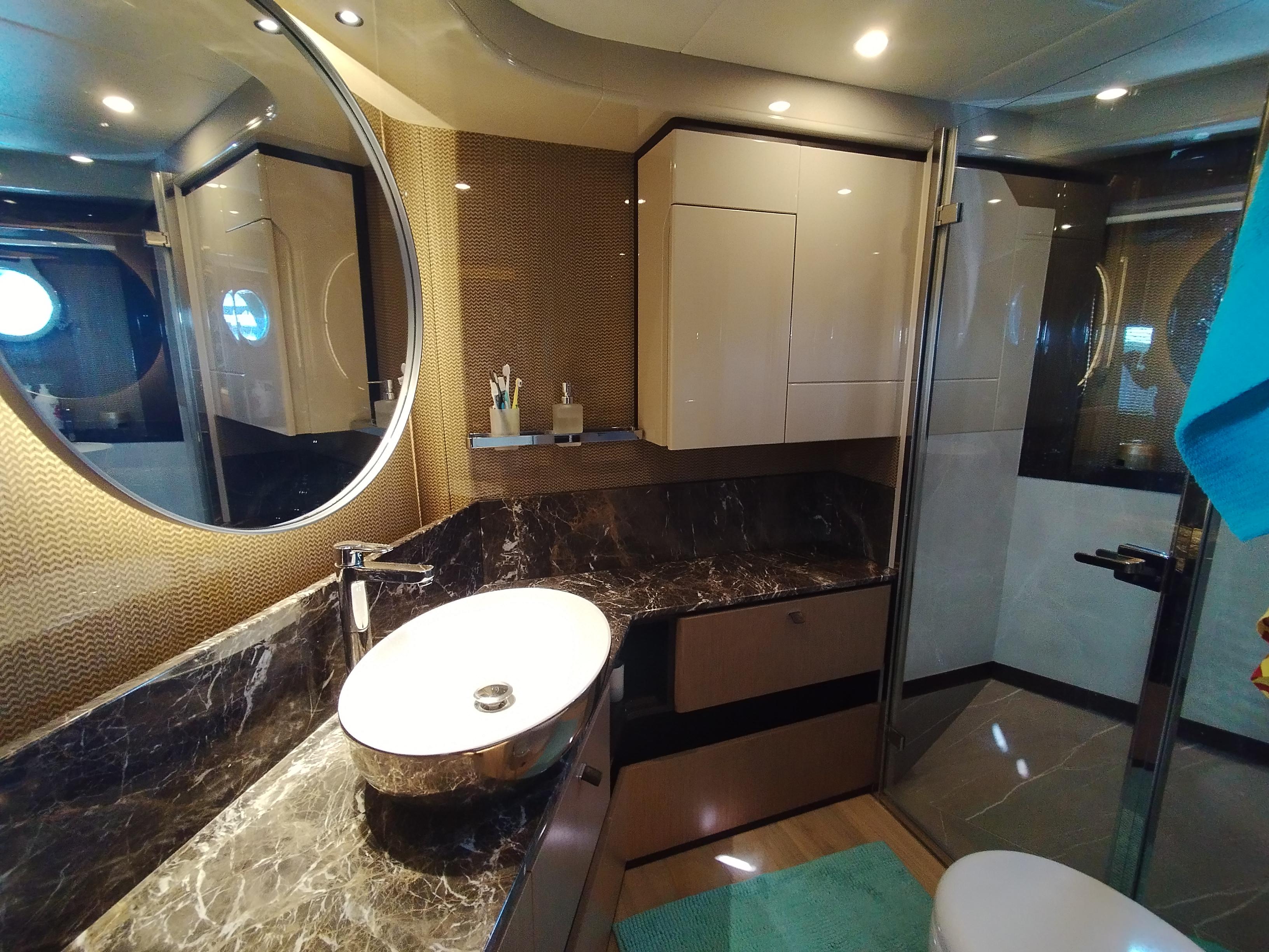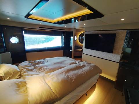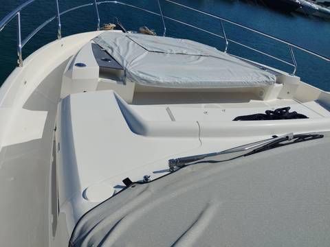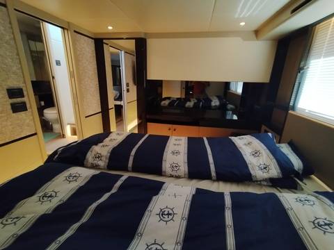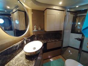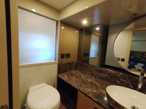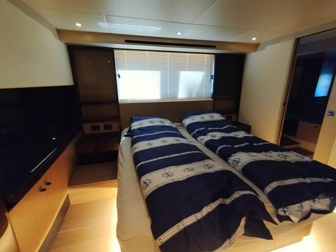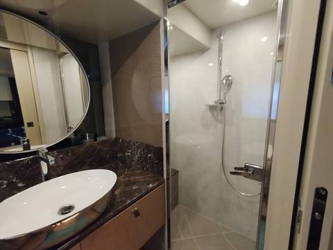 2nd refrigerator, glass ceramic cook top, dishwasher, washing machine, watermaker, toilet electric, separate crew cabine, owner cabin, guest cabin, bow cabin, salon, head, steering position inside, steering position on flybridge, fire extinguisher system, shore supply 220V, radio, cockpit cover, suncushion, pressurized water system, warm water system, transom door to bathing platform, wetbar, cockpit table, bathing ladder, under water light, underwater paint, holding tank, anchor windlass bow electric, anchor windlass stern electric, search light remote controlled, bathing platform hydraulic, gangway electric, trim tabs, electric/hydraulic, stern shower warm/could