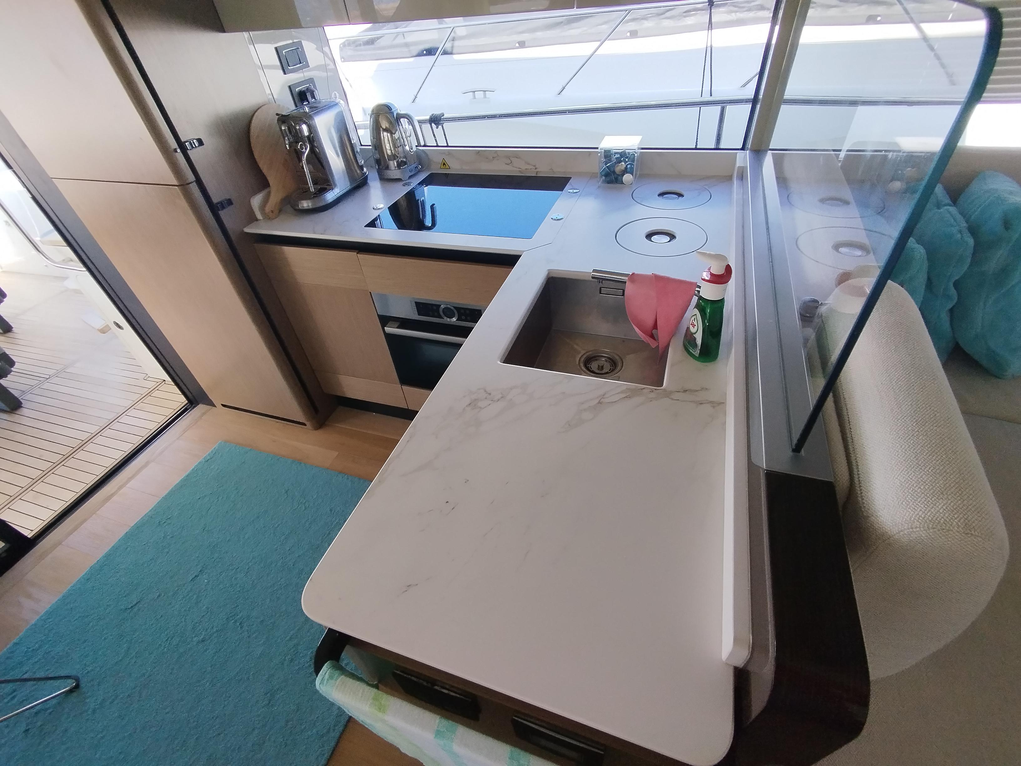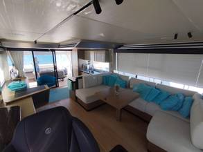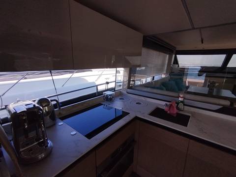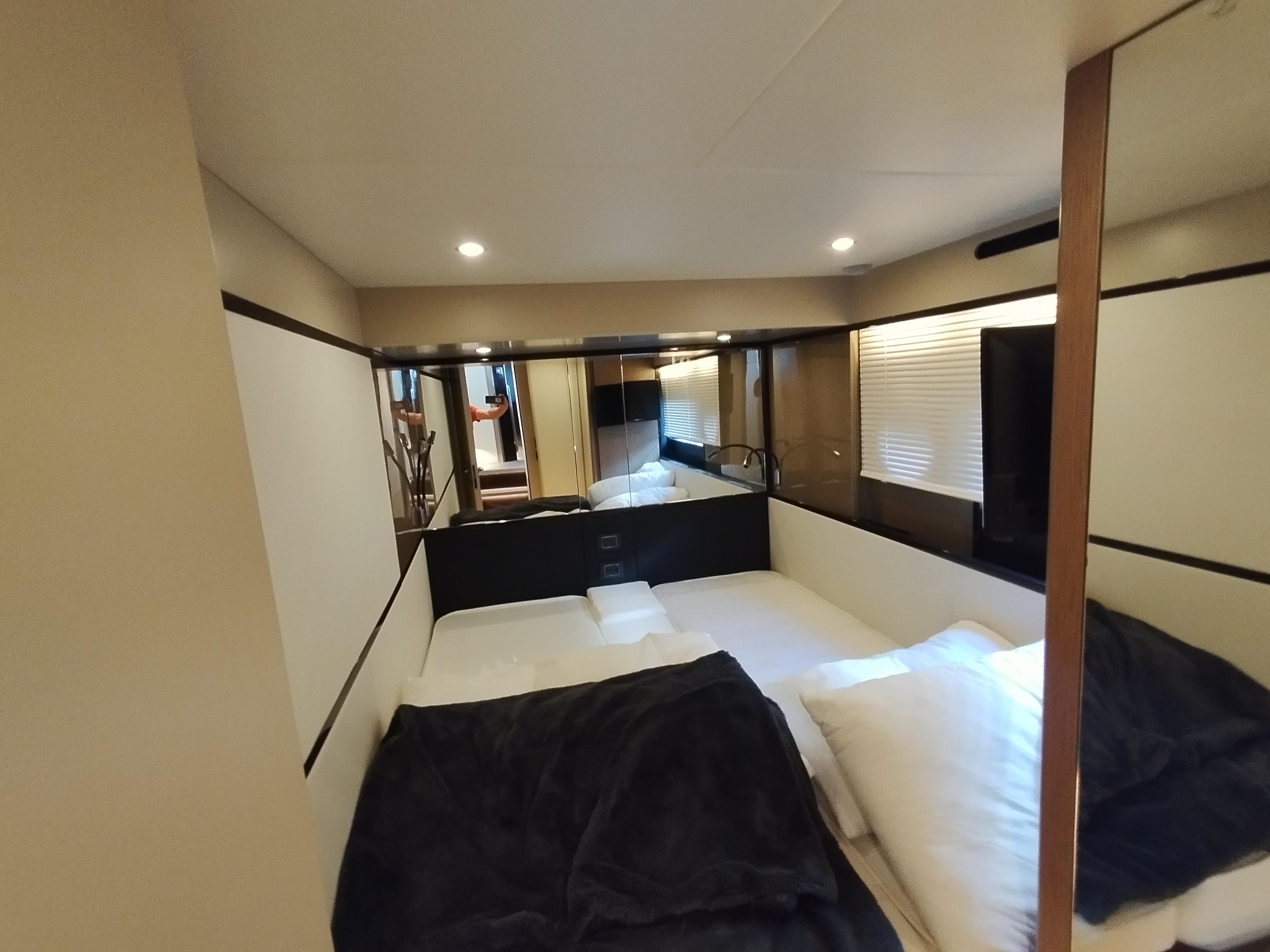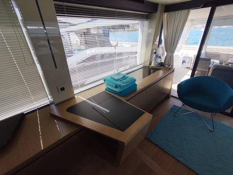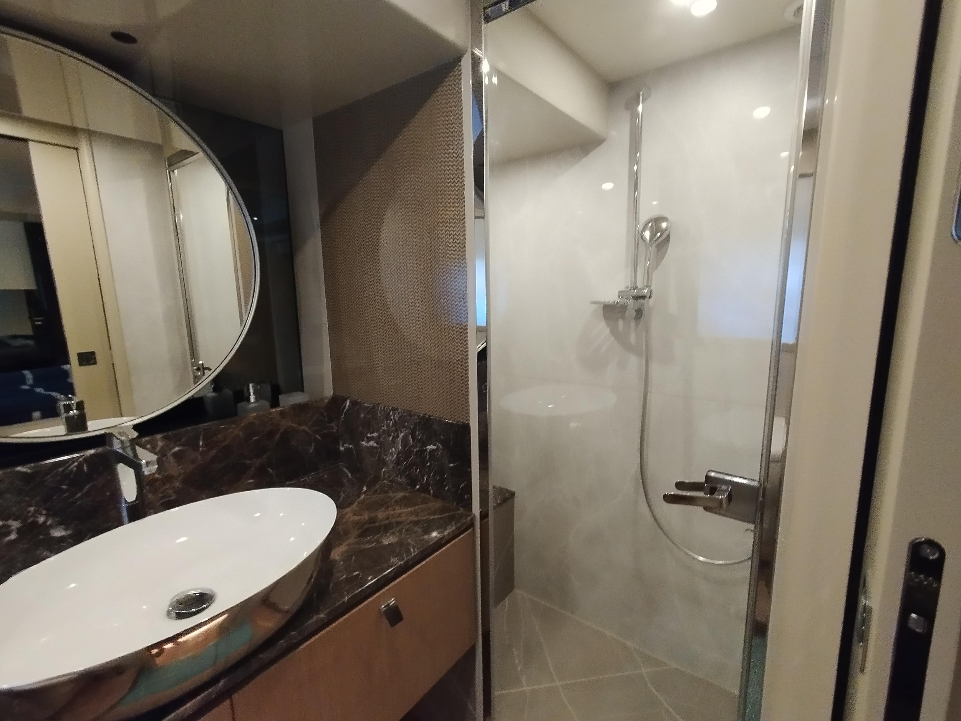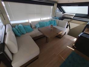 2nd refrigerator, glass ceramic cook top, dishwasher, washing machine, watermaker, toilet electric, separate crew cabine, owner cabin, guest cabin, bow cabin, salon, head, steering position inside, steering position on flybridge, fire extinguisher system, shore supply 220V, radio, cockpit cover, suncushion, pressurized water system, warm water system, transom door to bathing platform, wetbar, cockpit table, bathing ladder, under water light, underwater paint, holding tank, anchor windlass bow electric, anchor windlass stern electric, search light remote controlled, bathing platform hydraulic, gangway electric, trim tabs, electric/hydraulic, stern shower warm/could