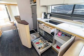glass ceramic cook top, dishwasher, icemaker, washing machine, watermaker, toilet electric, separate crew cabine, owner cabin, guest cabin, bow cabin, salon, head, steering position inside, steering position on flybridge, fire extinguisher system, shore supply 220V, radio, TV antenna satellite, suncushion, warm water system, transom door to bathing platform, teak deck, wetbar, cockpit table, bathing ladder, 220V plugs, underwater paint, holding tank, anchor windlass bow electric, searchlight, bathing platform hydraulic, gangway electric, trim tabs, electric/hydraulic, stern shower warm/could