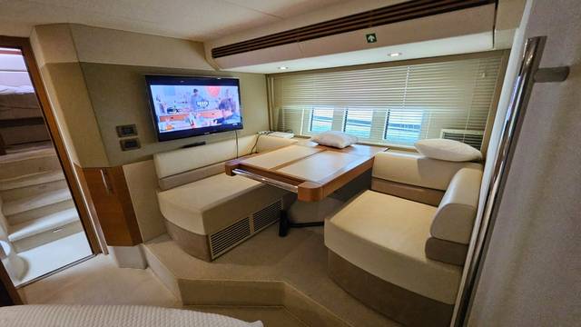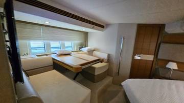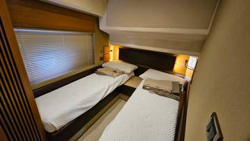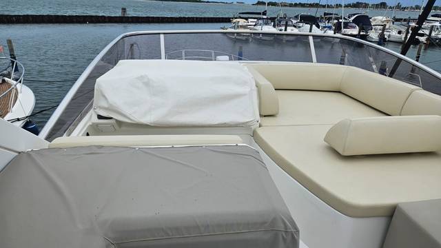 glass ceramic cook top, dishwasher, icemaker, washing machine, dryer, watermaker, toilet electric, separate crew cabine, owner cabin, guest cabin, bow cabin, head, steering position inside, steering position on flybridge, fire extinguisher system, radio, TV antenna satellite, cockpit cover, suncushion, pressurized water system, warm water system, transom door to bathing platform, teak deck, cockpit table, bathing ladder, underwater paint, anchor windlass bow electric, anchor windlass stern electric, bathing platform hydraulic, gangway electric, trim tabs, electric/hydraulic, stern shower warm/could