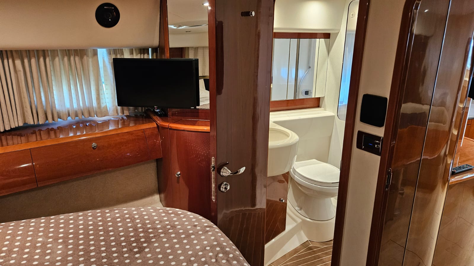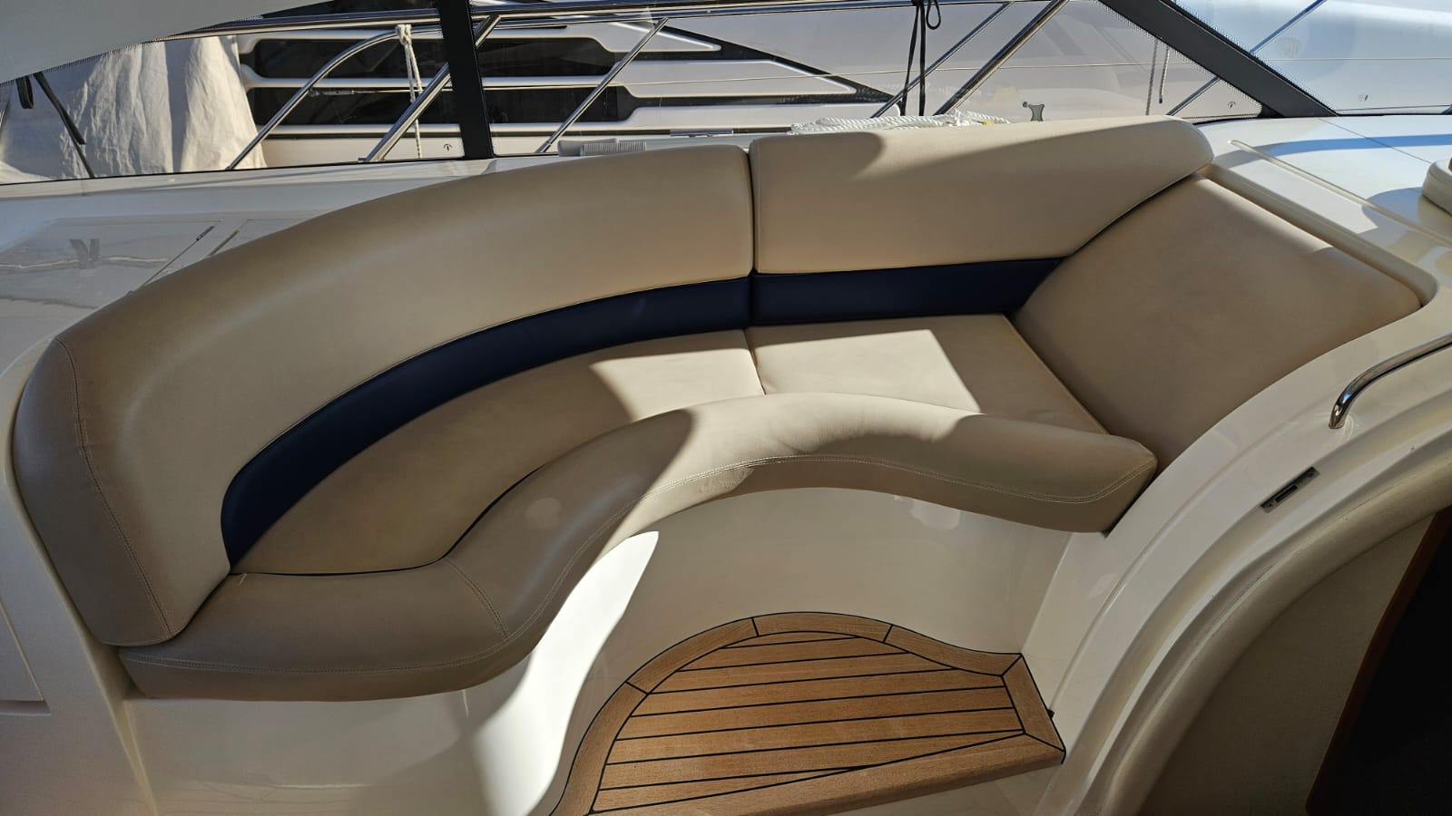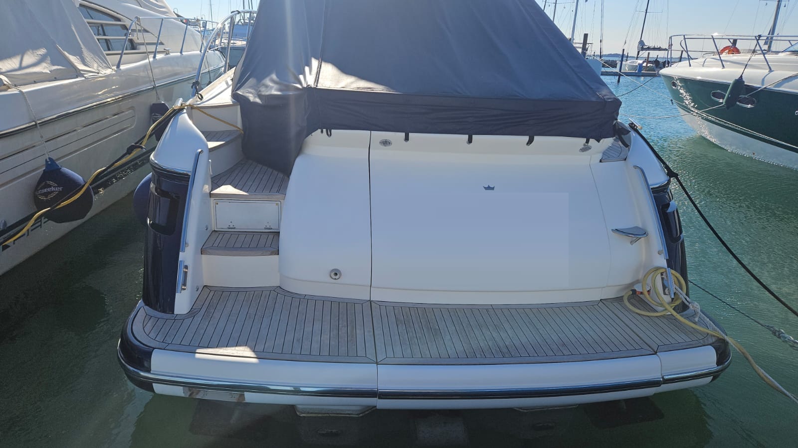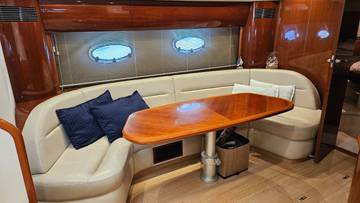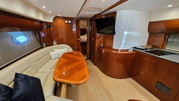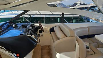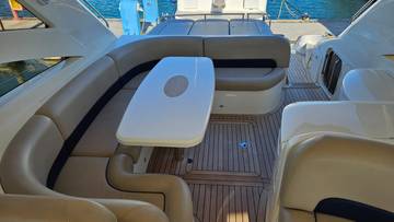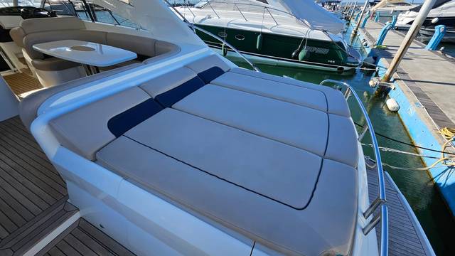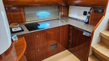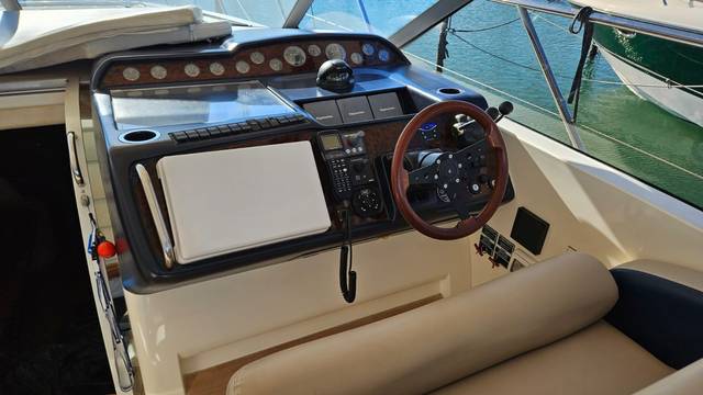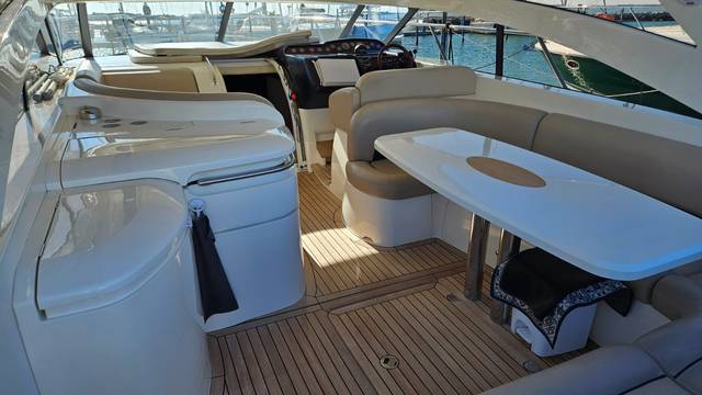 glass ceramic cook top, icemaker, toilet electric, owner cabin, guest cabin, salon, head, shore supply 220V, main circuit breaker, radio, TV antenna satellite, cockpit cover, suncushion, pressurized water system, warm water system, bathing platform integrated, transom door to bathing platform, wetbar, cockpit table, bathing ladder, 220V plugs, underwater paint, engine battery, voltmeter, anchor windlass bow electric, windscreen wiper, searchlight, gangway electric, trim tabs, electric/hydraulic, stern shower warm/could