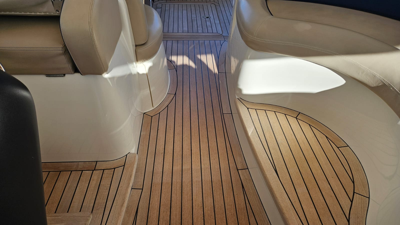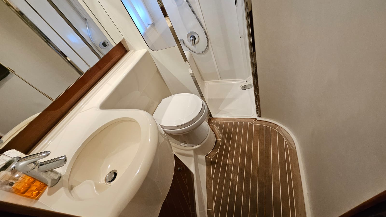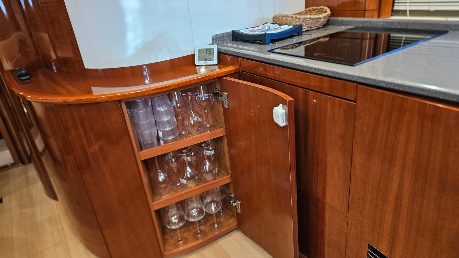 glass ceramic cook top, icemaker, toilet electric, owner cabin, guest cabin, salon, head, shore supply 220V, main circuit breaker, radio, TV antenna satellite, cockpit cover, suncushion, pressurized water system, warm water system, bathing platform integrated, transom door to bathing platform, wetbar, cockpit table, bathing ladder, 220V plugs, underwater paint, engine battery, voltmeter, anchor windlass bow electric, windscreen wiper, searchlight, gangway electric, trim tabs, electric/hydraulic, stern shower warm/could