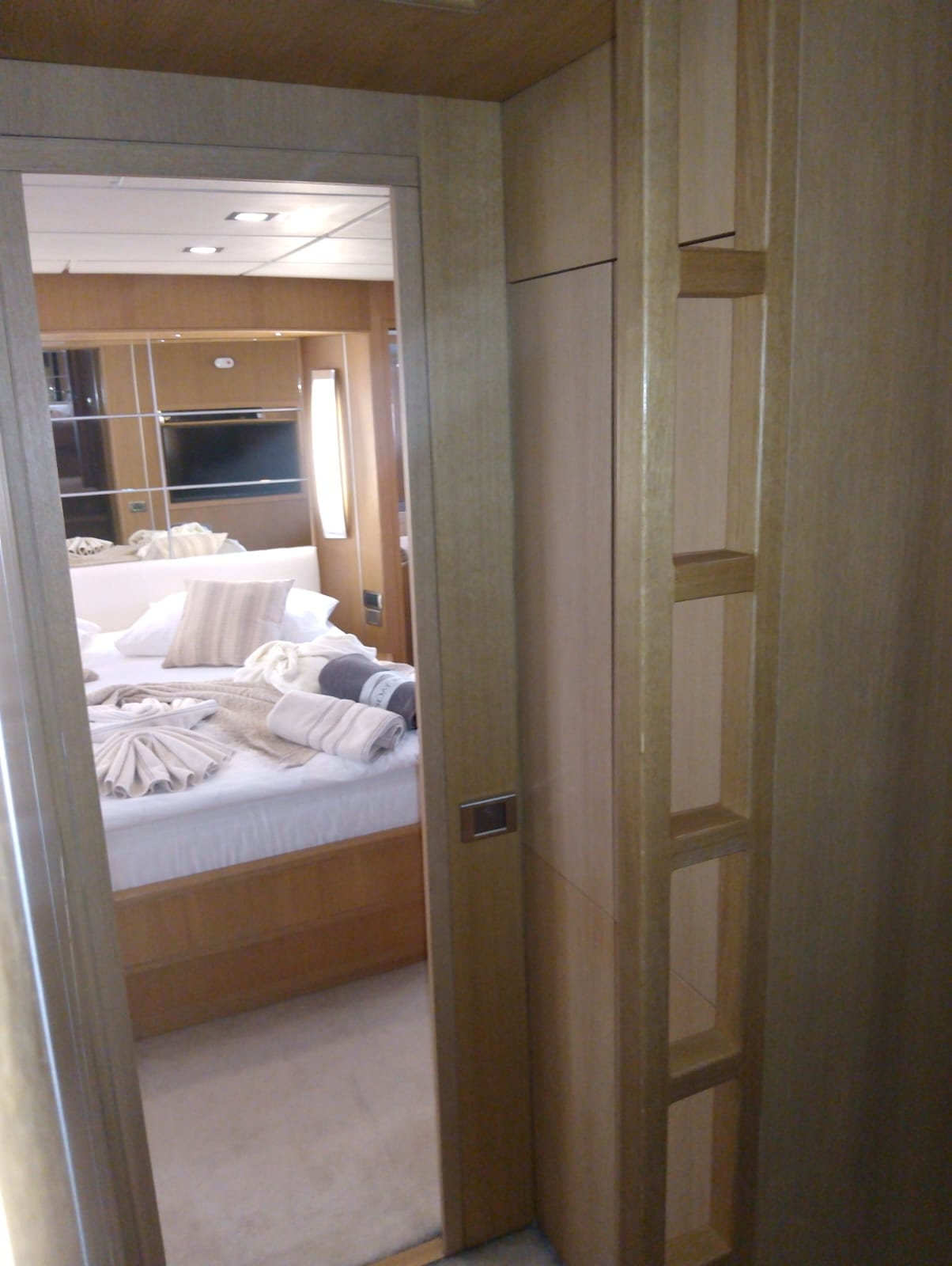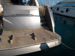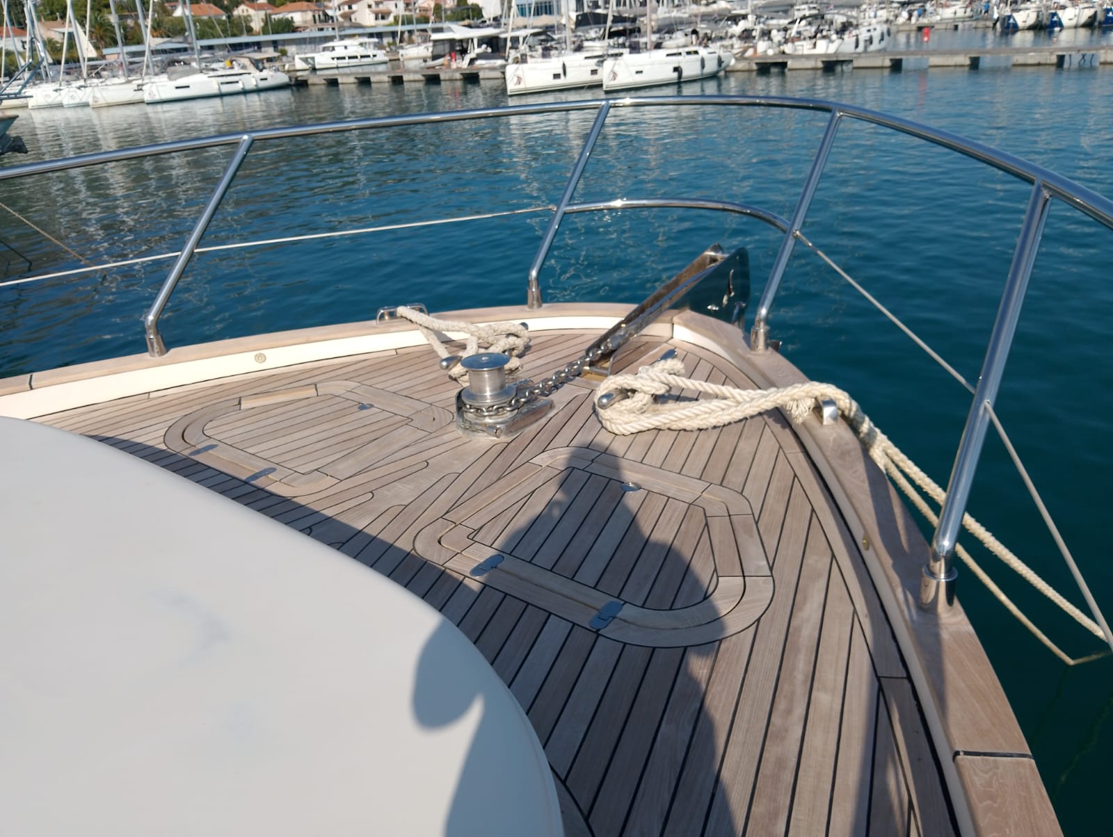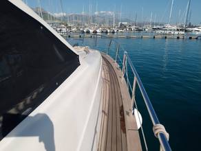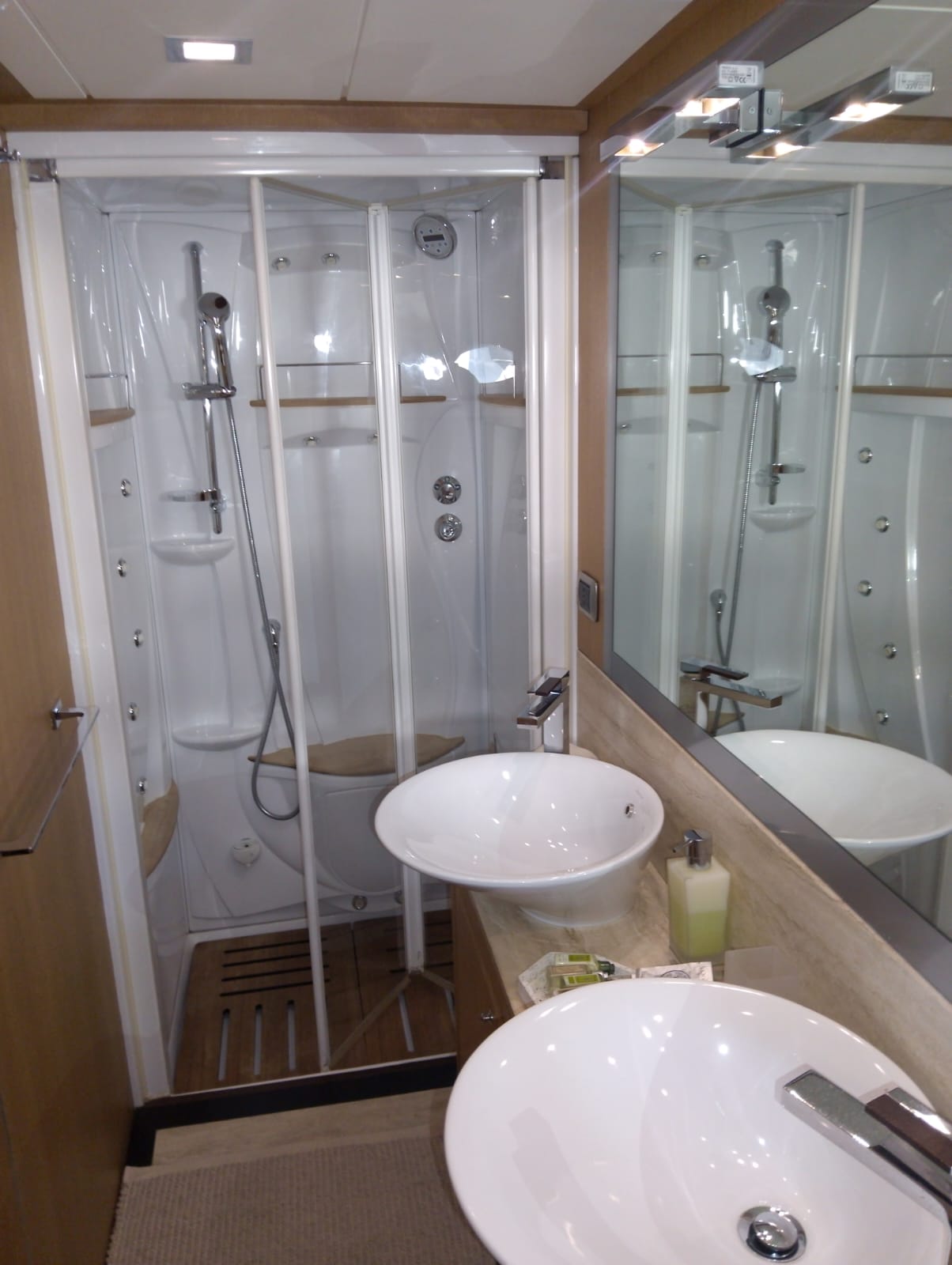 glass ceramic cook top, dishwasher, icemaker, washing machine, watermaker, toilet electric, owner cabin, guest cabin, bow cabin, salon, head, steering position inside, steering position on flybridge, fire extinguisher system, radio, TV antenna satellite, sun shade / aftdeck, suncushion, warm water system, bathing platform integrated, transom door to bathing platform, teak deck, cockpit table, bathing ladder, underwater paint, holding tank, anchor windlass bow electric, search light remote controlled, gangway electric, trim tabs, electric/hydraulic, stern shower warm/could