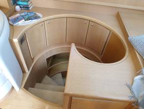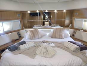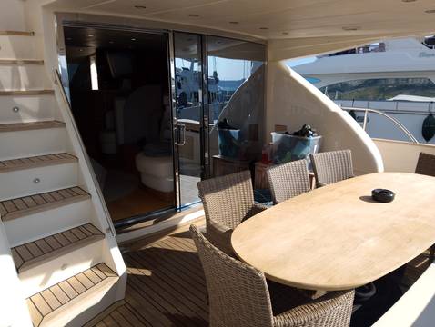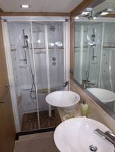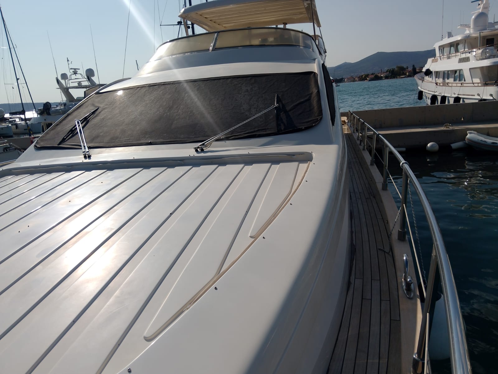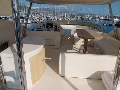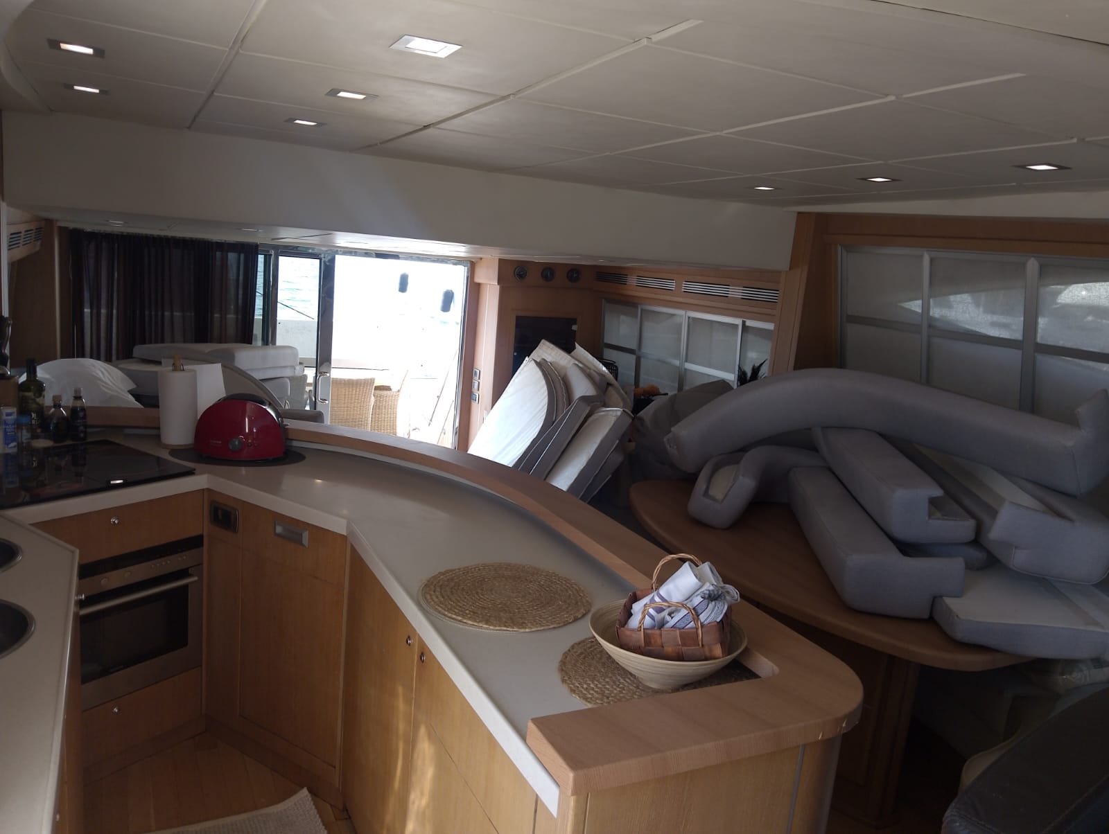 glass ceramic cook top, dishwasher, icemaker, washing machine, watermaker, toilet electric, owner cabin, guest cabin, bow cabin, salon, head, steering position inside, steering position on flybridge, fire extinguisher system, radio, TV antenna satellite, sun shade / aftdeck, suncushion, warm water system, bathing platform integrated, transom door to bathing platform, teak deck, cockpit table, bathing ladder, underwater paint, holding tank, anchor windlass bow electric, search light remote controlled, gangway electric, trim tabs, electric/hydraulic, stern shower warm/could