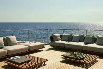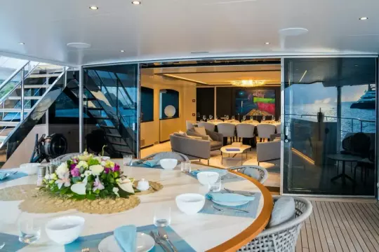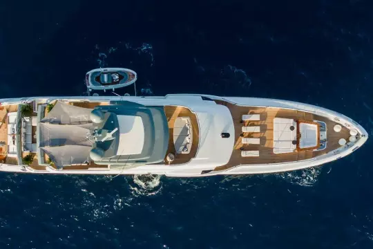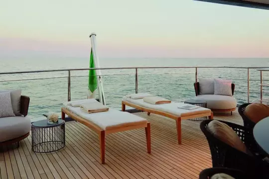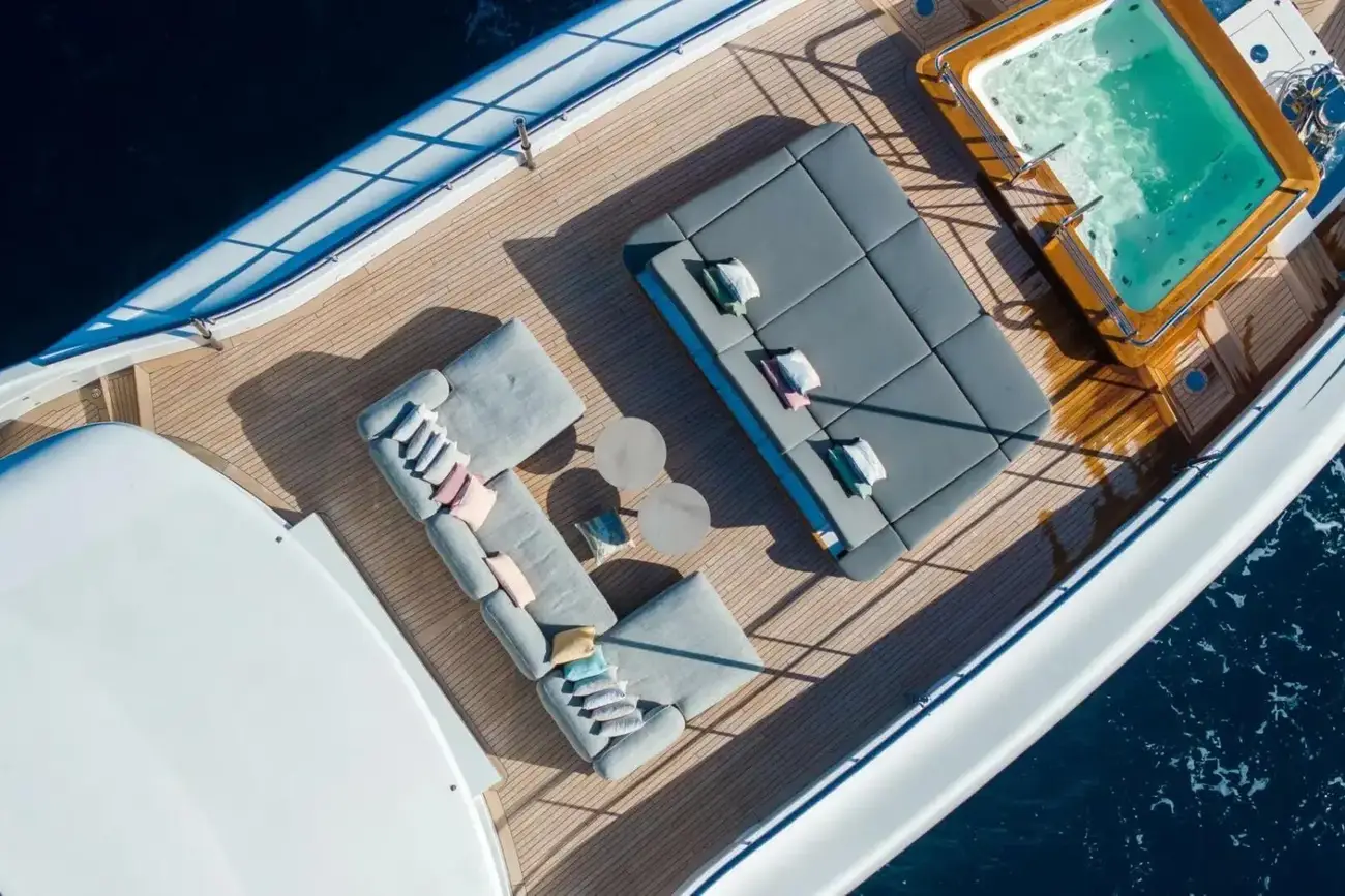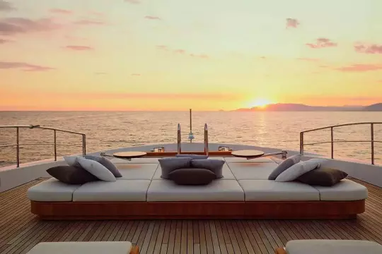 Exterior: Inspiring Blissful Relaxation Designed by Giorgio M. Cassetta, WATERCOLOURS features a refined superstructure, high hull sides, and contemporary flared bow for understated elegance. Guests enjoy multiple outdoor spaces: a spacious sundeck with alfresco dining for 12, fully serviced bar, foredeck sun pads and jacuzzi for sunbathing or cocktails, upper deck with circular dining table and expansive seating, main aft-deck dining for relaxed meals, and an elegant beach club with expansive swim platform for seamless water access. Superlative amenities across all decks promote rest and rejuvenation.