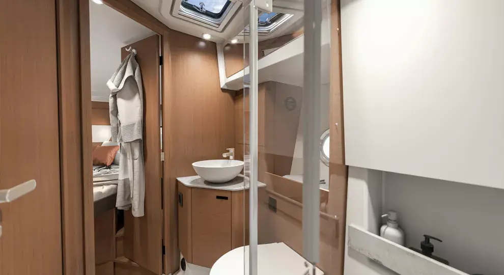 The galley and bathroom feature Corian worksurfaces as standard, while the new décor and comfort Luxe pack can further enhance life on board.
