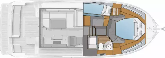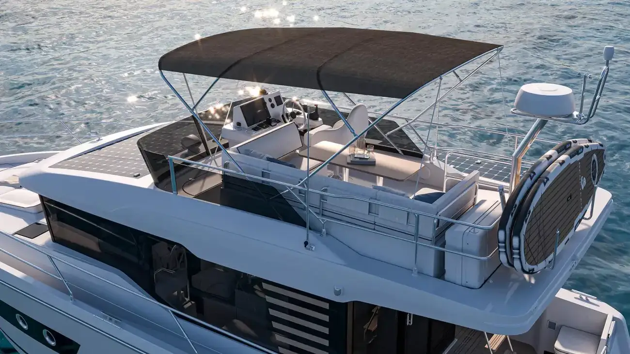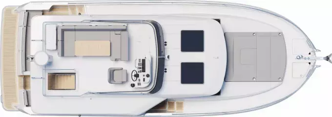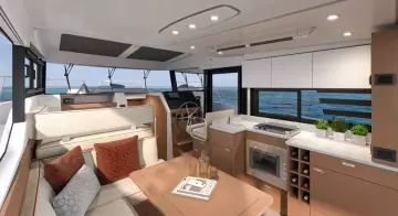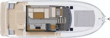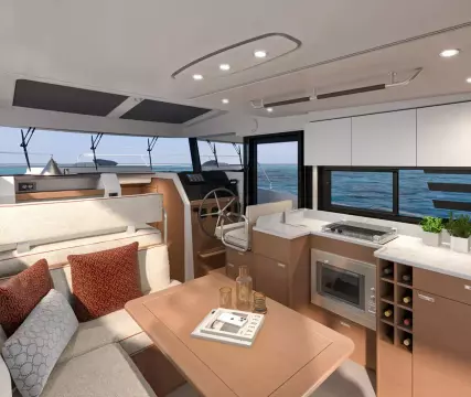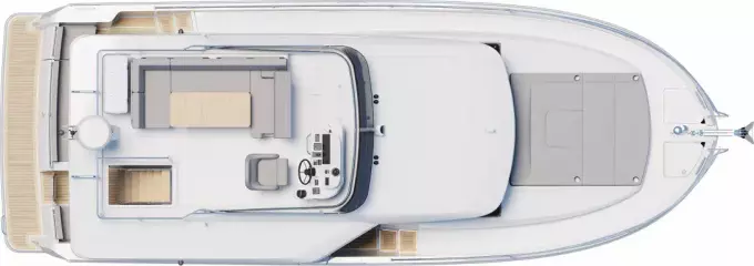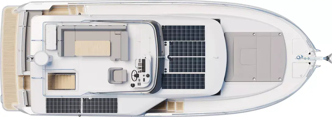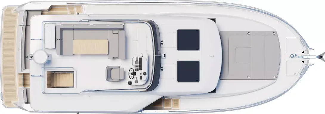 The stunning Flybridge configuration features a raised helm position with excellent visibility alongside a very social u-shaped seat with a forward-adaptive backrest, table and built-in coolbox.