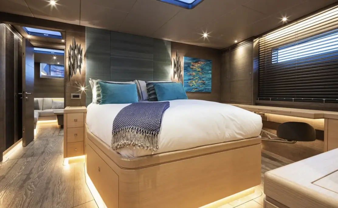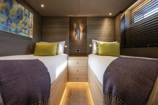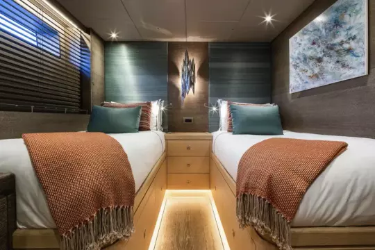 Liara sleeps 8 guests in 4 luxuriously appointed ensuite cabins. Consisting of the owners double suite forward, a double VIP cabin midships and two twin cabins aft of the saloon. There are also 3 dedicated crew cabins aft which sleep 5 in total. The beautiful interior, by Adam Lay Studios, reflects the owner's love of the natural environment; utilizing calm, high-quality limed and stained oak joinery throughout the yachts unusually spacious accommodation.