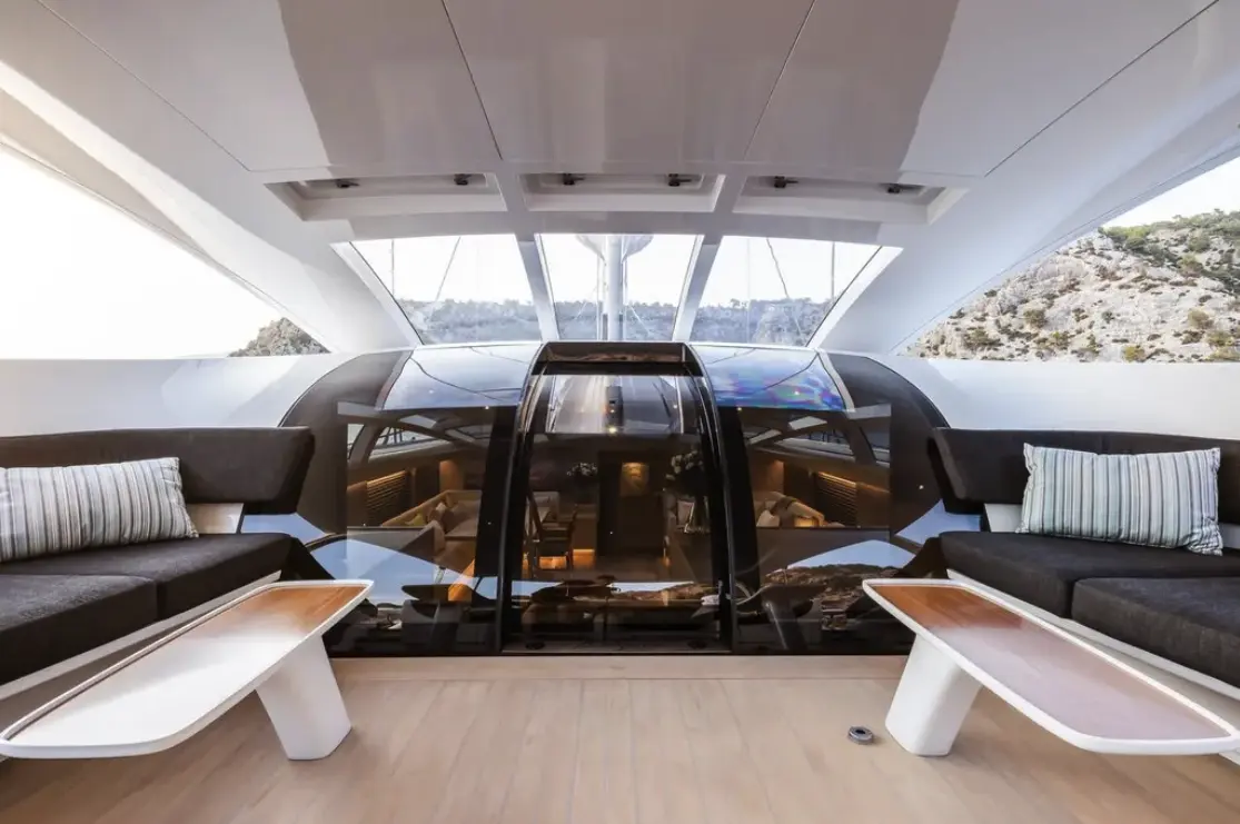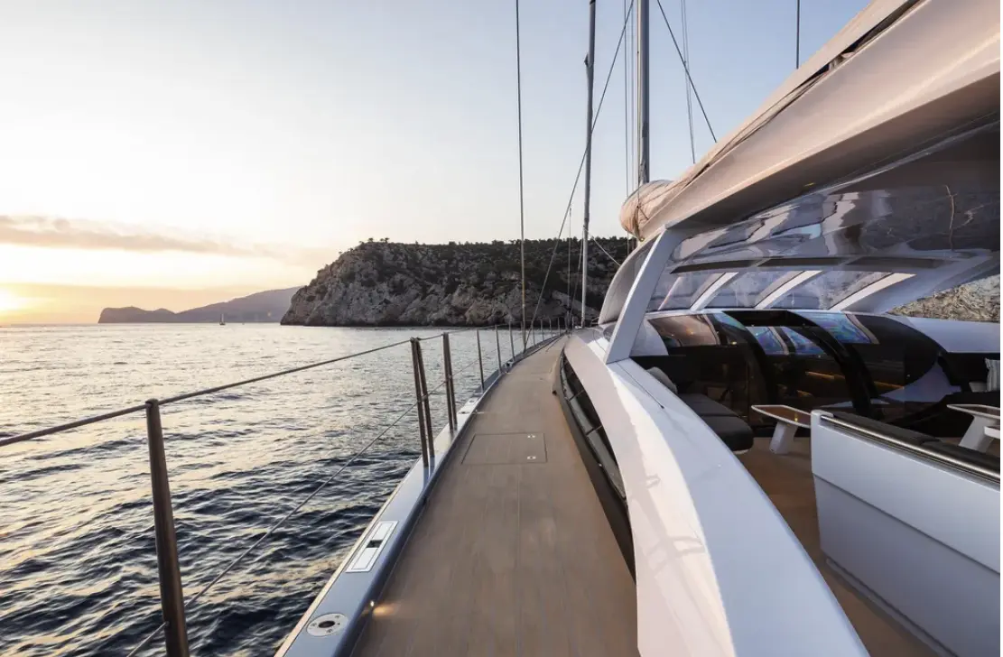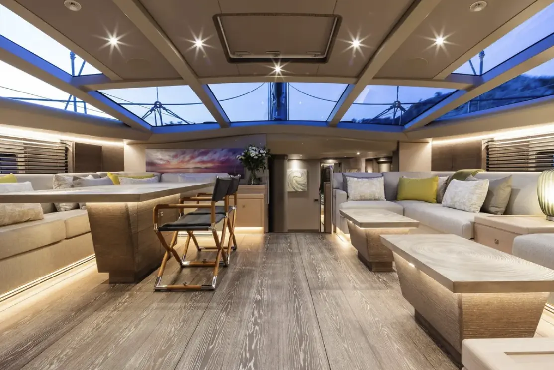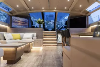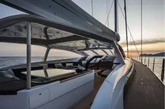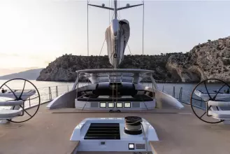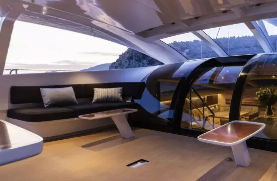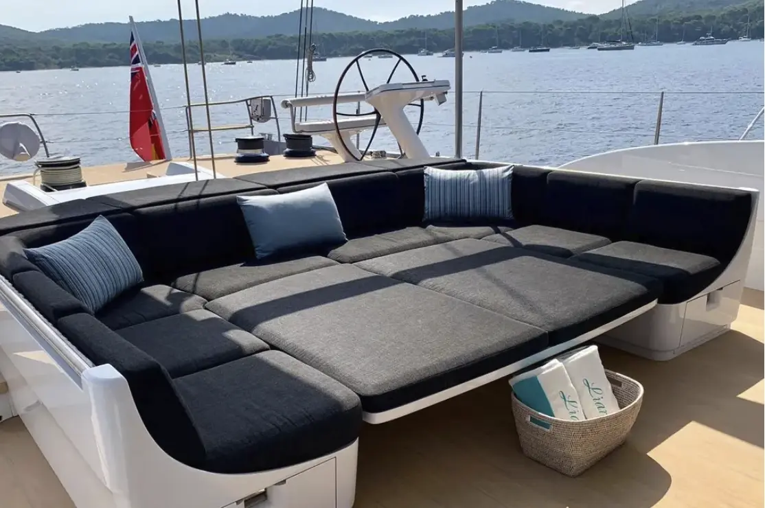On deck, Liara is built for ultimate guest comfort and sociability. Her large, protected guest cockpit features lounging sofas and a sunpad for relaxation, alongside a generous U-shaped dining area. Liara's focus on versatility is evident in the striking, yet easily removable, carbon bimini top. This hard top bimini provides excellent shelter while cruising, or a clean performance-optimised deck for racing when removed. For long-range passages, her 5.5m Ribeye tender can be neatly stowed on the foredeck or on the aft deck.