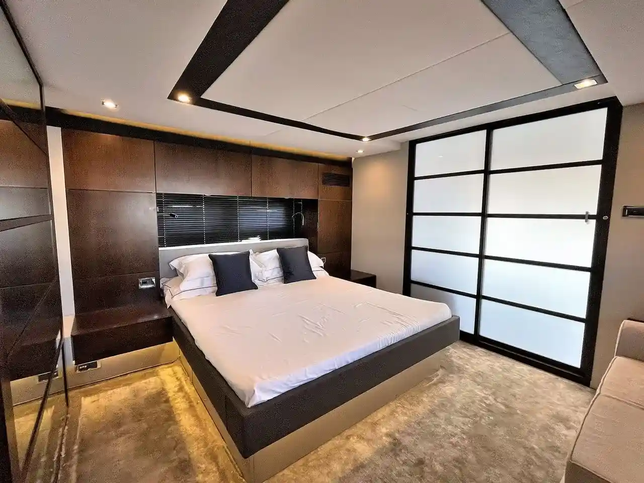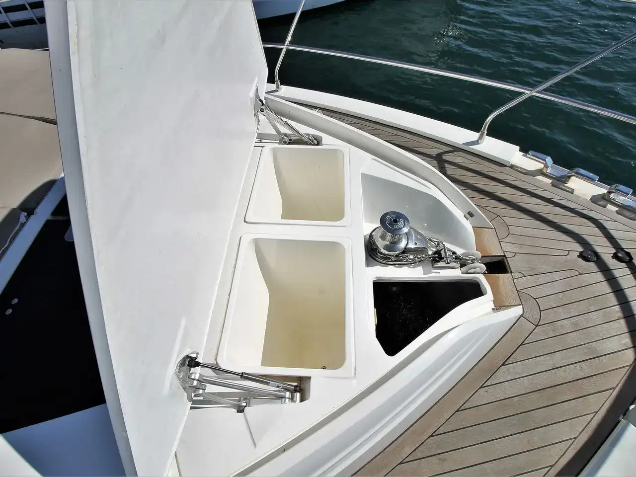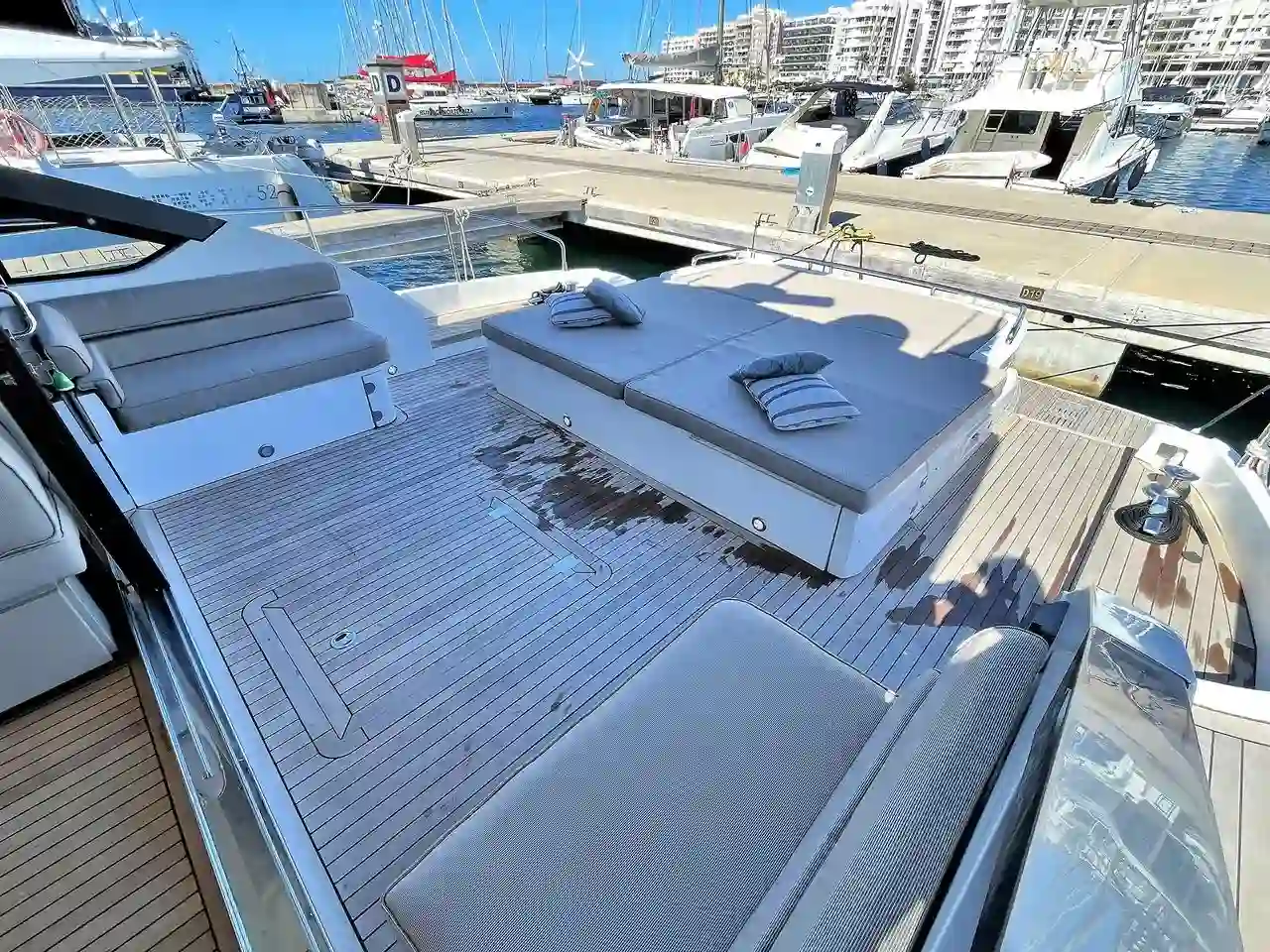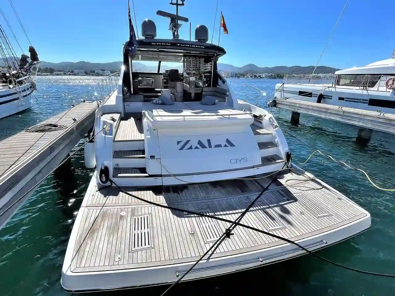 The layout consists of a huge aft cockpit area with two seatings starboard and port side and big aft sunpad. The exterior is completed by the massive bathing platform which is one of the key features of the 62 Targa and the upgraded larger sunpad at bow. The deck saloon with its comfortable seating and dining table is the social heart of the boat. The galley is well equipped and replenished by an additional freezer and wine cooler in the lower lobby. Zala offers a three cabin layout with forward master cabin with en suite bathroom and two twin cabins at port and starboard sharing one bathroom. She has got a white hull with black waterline. The exterior is equipped with teak flooring and beige upholstery. Interior finishes are silk carpets in cabins, teak floor in the deck saloon and beige fabric upholstery.