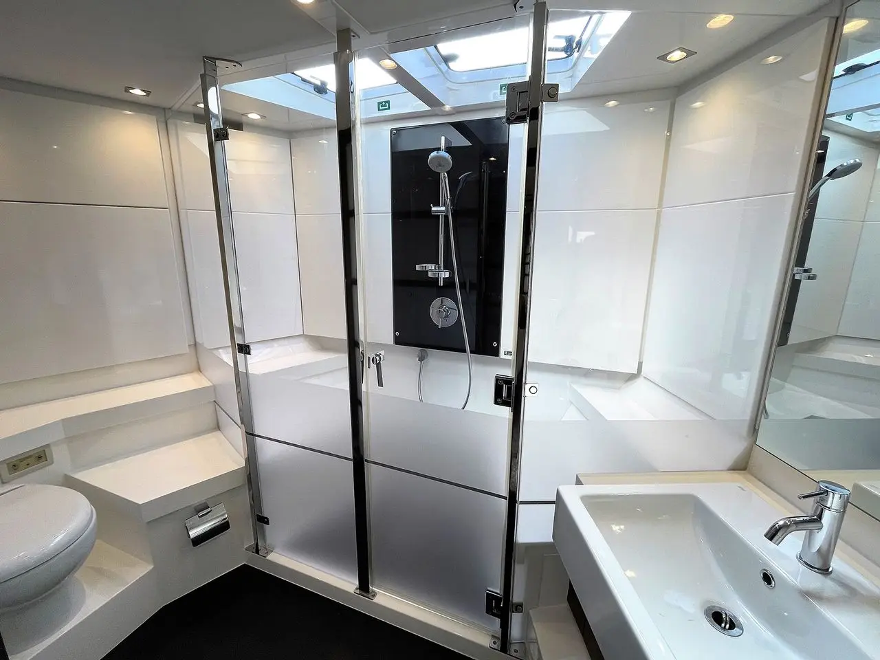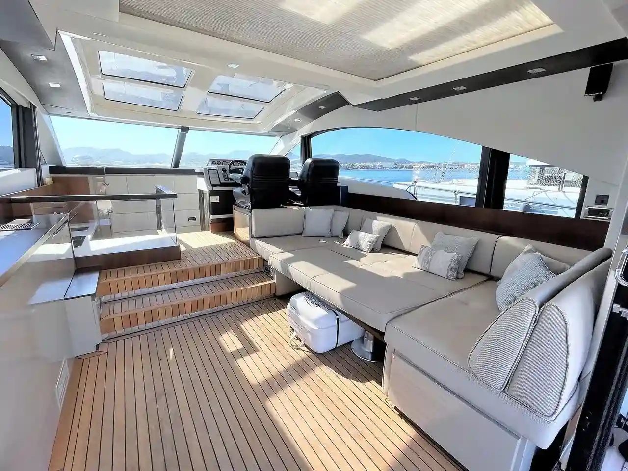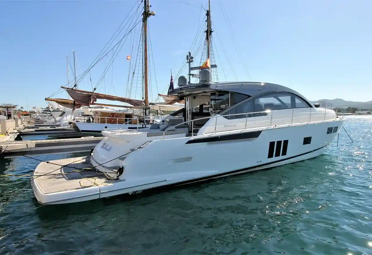 The layout consists of a huge aft cockpit area with two seatings starboard and port side and big aft sunpad. The exterior is completed by the massive bathing platform which is one of the key features of the 62 Targa and the upgraded larger sunpad at bow. The deck saloon with its comfortable seating and dining table is the social heart of the boat. The galley is well equipped and replenished by an additional freezer and wine cooler in the lower lobby. Zala offers a three cabin layout with forward master cabin with en suite bathroom and two twin cabins at port and starboard sharing one bathroom. She has got a white hull with black waterline. The exterior is equipped with teak flooring and beige upholstery. Interior finishes are silk carpets in cabins, teak floor in the deck saloon and beige fabric upholstery.