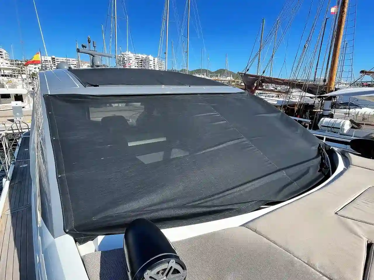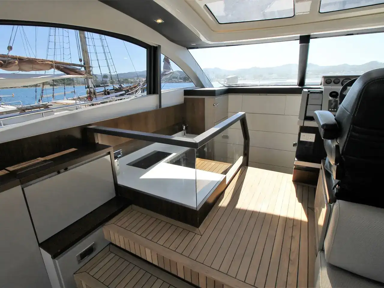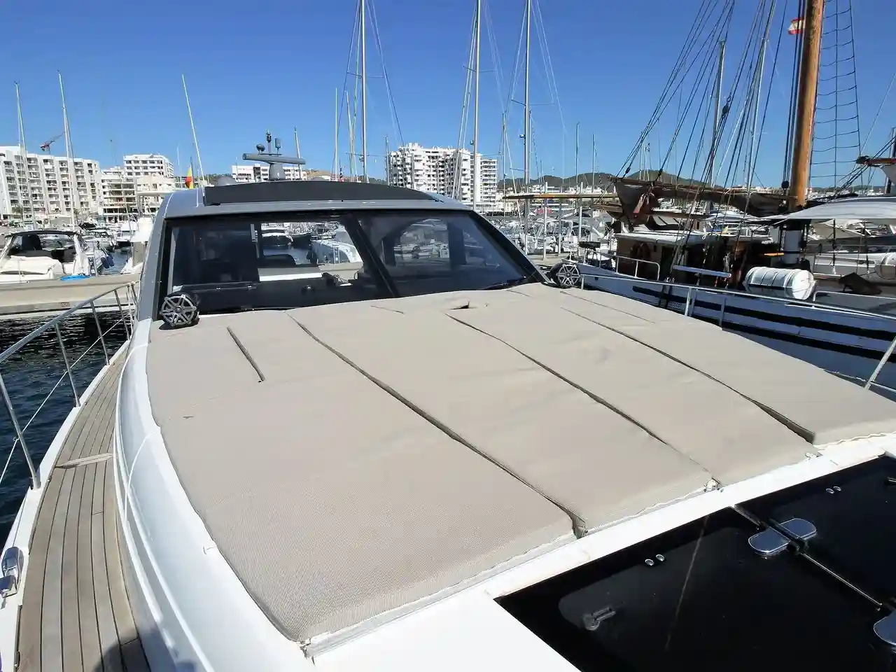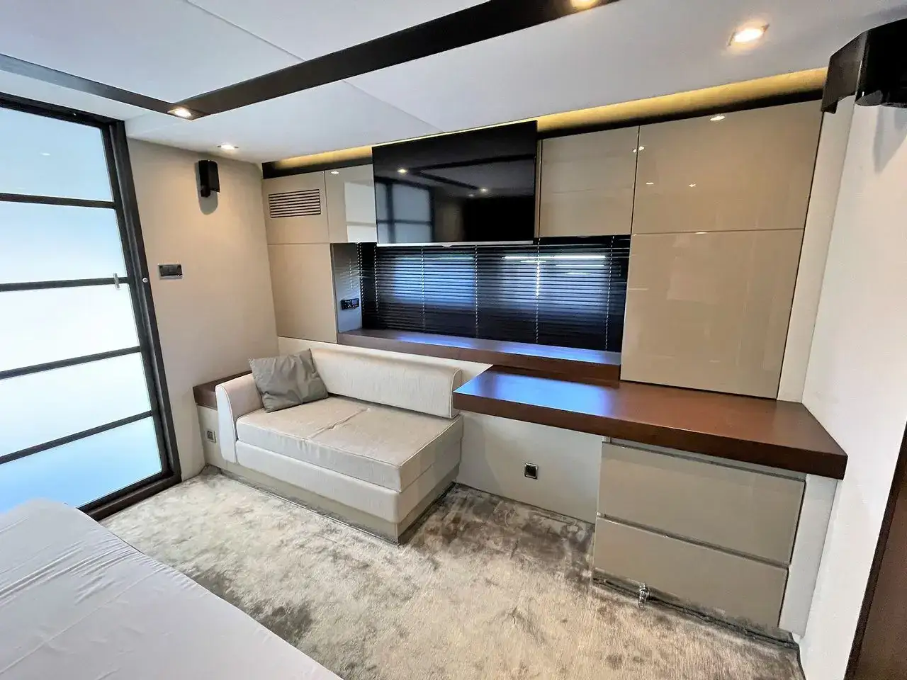 The layout consists of a huge aft cockpit area with two seatings starboard and port side and big aft sunpad. The exterior is completed by the massive bathing platform which is one of the key features of the 62 Targa and the upgraded larger sunpad at bow. The deck saloon with its comfortable seating and dining table is the social heart of the boat. The galley is well equipped and replenished by an additional freezer and wine cooler in the lower lobby. Zala offers a three cabin layout with forward master cabin with en suite bathroom and two twin cabins at port and starboard sharing one bathroom. She has got a white hull with black waterline. The exterior is equipped with teak flooring and beige upholstery. Interior finishes are silk carpets in cabins, teak floor in the deck saloon and beige fabric upholstery.