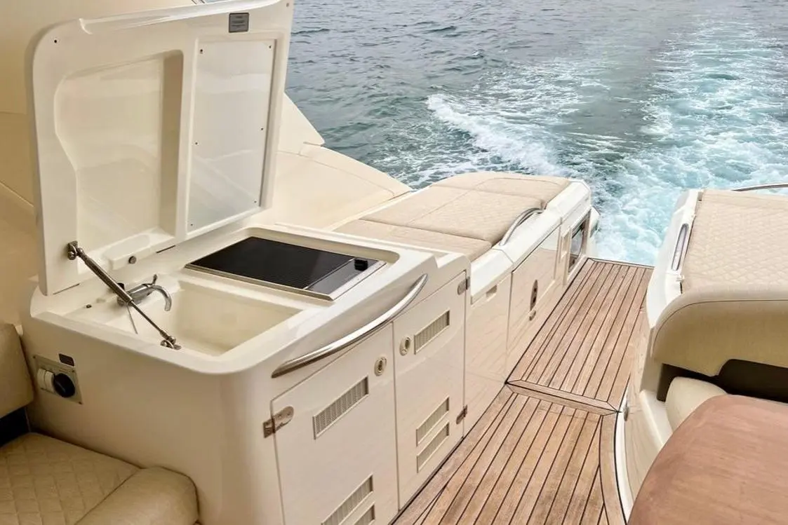 Featuring three cabins and two bathrooms, it provides ample space for extended cruising. Powered by Volvo Penta D12-800 EVC engines, this British-built yacht delivers an exhilarating ride. The spacious, well-appointed interiors create a true luxury apartment feel on the water. A perfect balance of elegance and functionality, ready for its next owner.