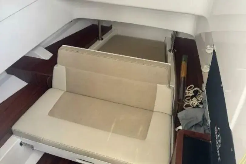 Below, the cabin offers air-conditioned comfort with a berth, enclosed head with VacuFlush, and plenty of storage — perfect for weekend cruising or escaping the midday heat.