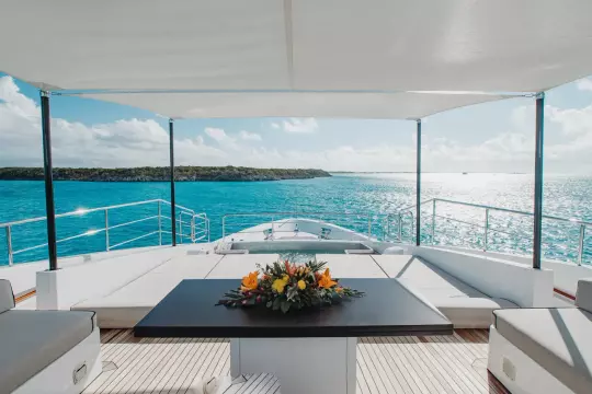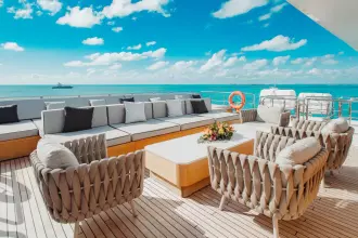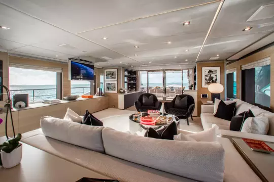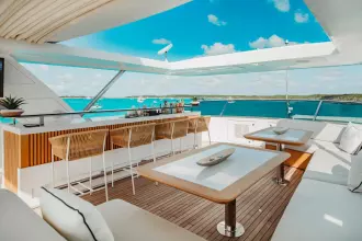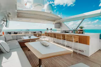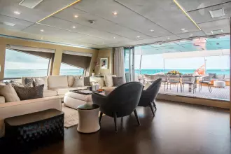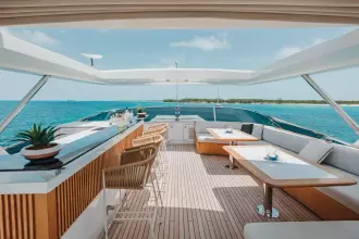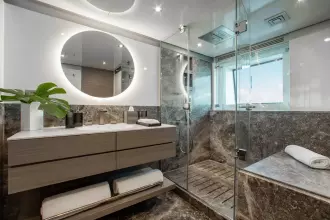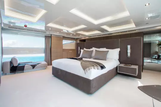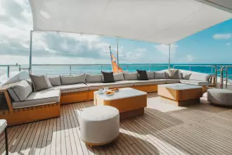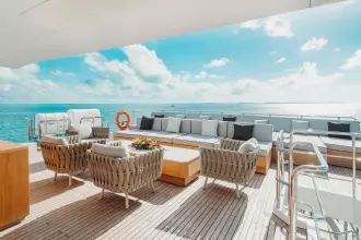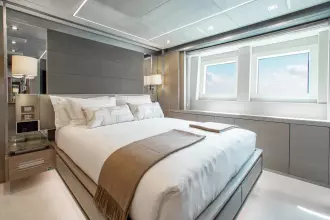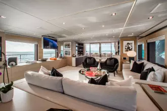 With superyacht level amenities, she offers a very large full beam master stateroom, made even more spacious with a starboard side balcony and a very large sundeck measuring 830 sq feet with pool.