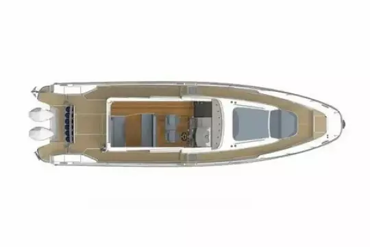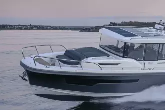 The heart of the boat is the cozy spacious salon with large light inlets and a seating arrangement that can easily be adjusted depending on activity. For example, transport for 9 people in the direction of travel, dinette for lunch or a large u-sofa for socializing. The flexibility comes from the fact that the two sofas can be folded and moved to different positions depending on the desired functionality with simple handles and that the table can be raised, lowered, rotated and folded. The salon has several easily accessible stowage compartments. The high ceiling height and natural lighting in the salon combined with fully opened side doors, open stern door and fully opened roof hatches gives the feel of an open boat. The helm seats two people in typical snug Nimbus manner and has plenty of storage compartments. As a driver you can choose to stand or sit while driving. The dashboard has space for two 12-inch plotters. Options include professional suspension seats and joystick steering.
