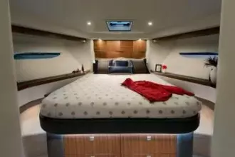 Large fixed skylights and two electric sliding sunroofs are built into the curvaceous fibreglass hardtop, enhancing natural light and ventilation throughout the entirety of the 6000 Sport Yacht – from the expansive cockpit to the luxuriously furnished saloon and through to the generous-sized staterooms on the accommodation deck.