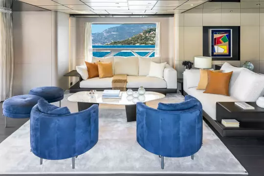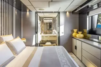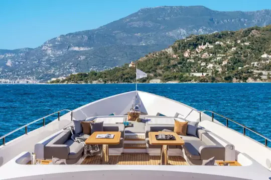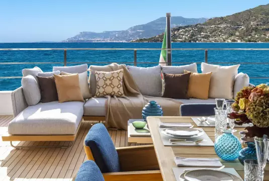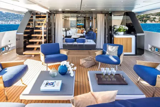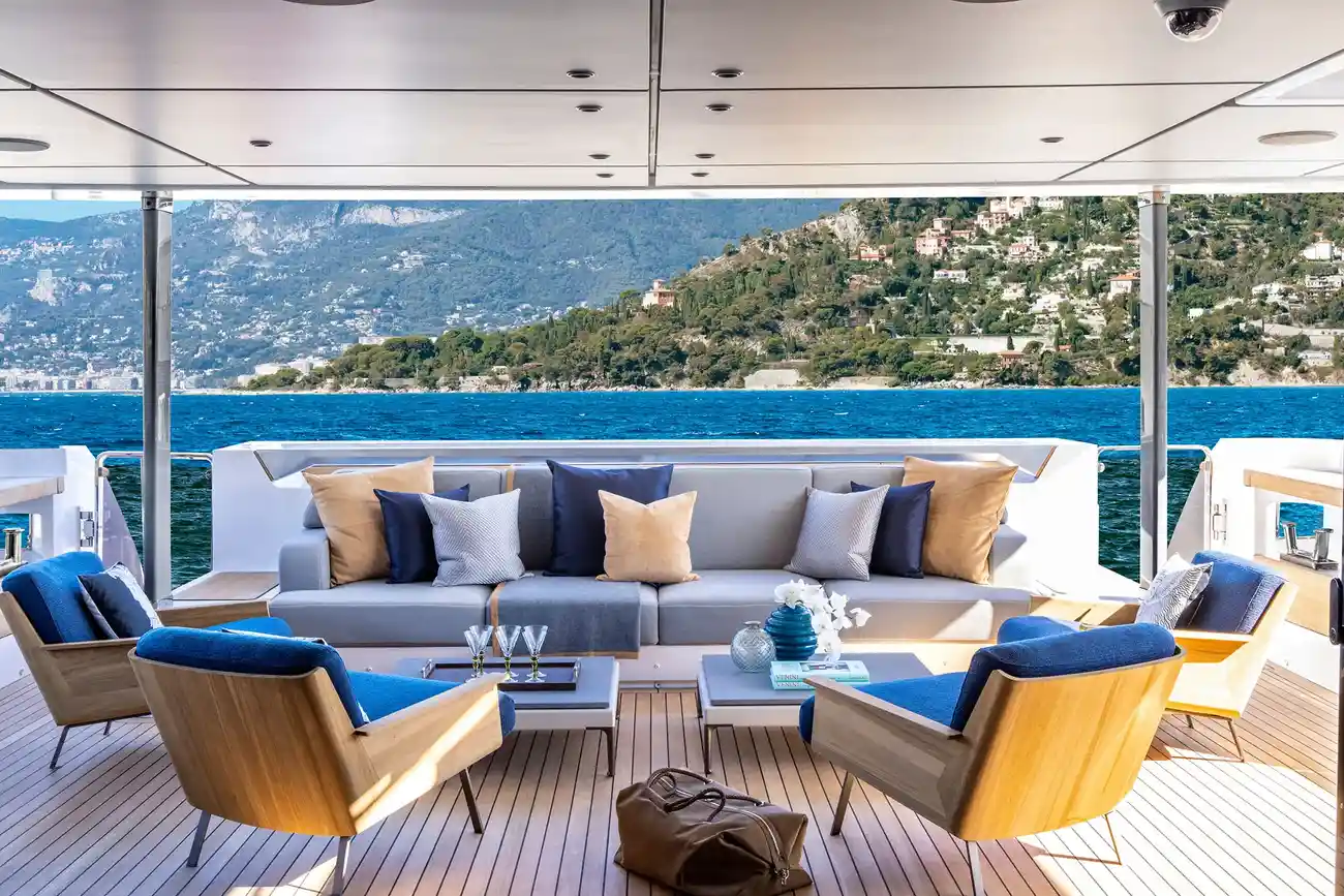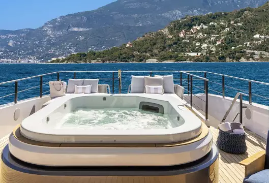 Her MCA compliance reinforces her profile as the ideal yacht for high-end charter operations, guaranteeing top safety and operational standards. Expansive exterior decks are designed to offer exclusive areas dedicated to relaxation and entertainment: a panoramic Jacuzzi, elegant lounge areas, and finely furnished sun decks blend seamlessly with the sea, creating perfect settings for moments of pure wellbeing.