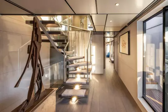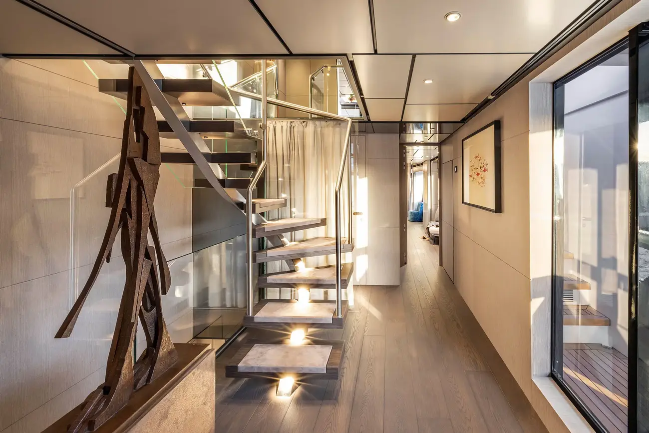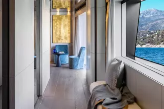 The interiors reflect pure, sophisticated elegance, with each cabin conceived as a private retreat characterized by handcrafted finishes and bespoke furnishings. Large panoramic windows flood the spaces with natural light and frame the sea, seamlessly connecting indoors and outdoors. Among her most exclusive features, the full-beam owner’s suite includes a private balcony overlooking the sea, a rare detail that transforms the space into a true haven of intimacy and style.