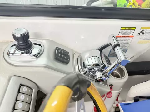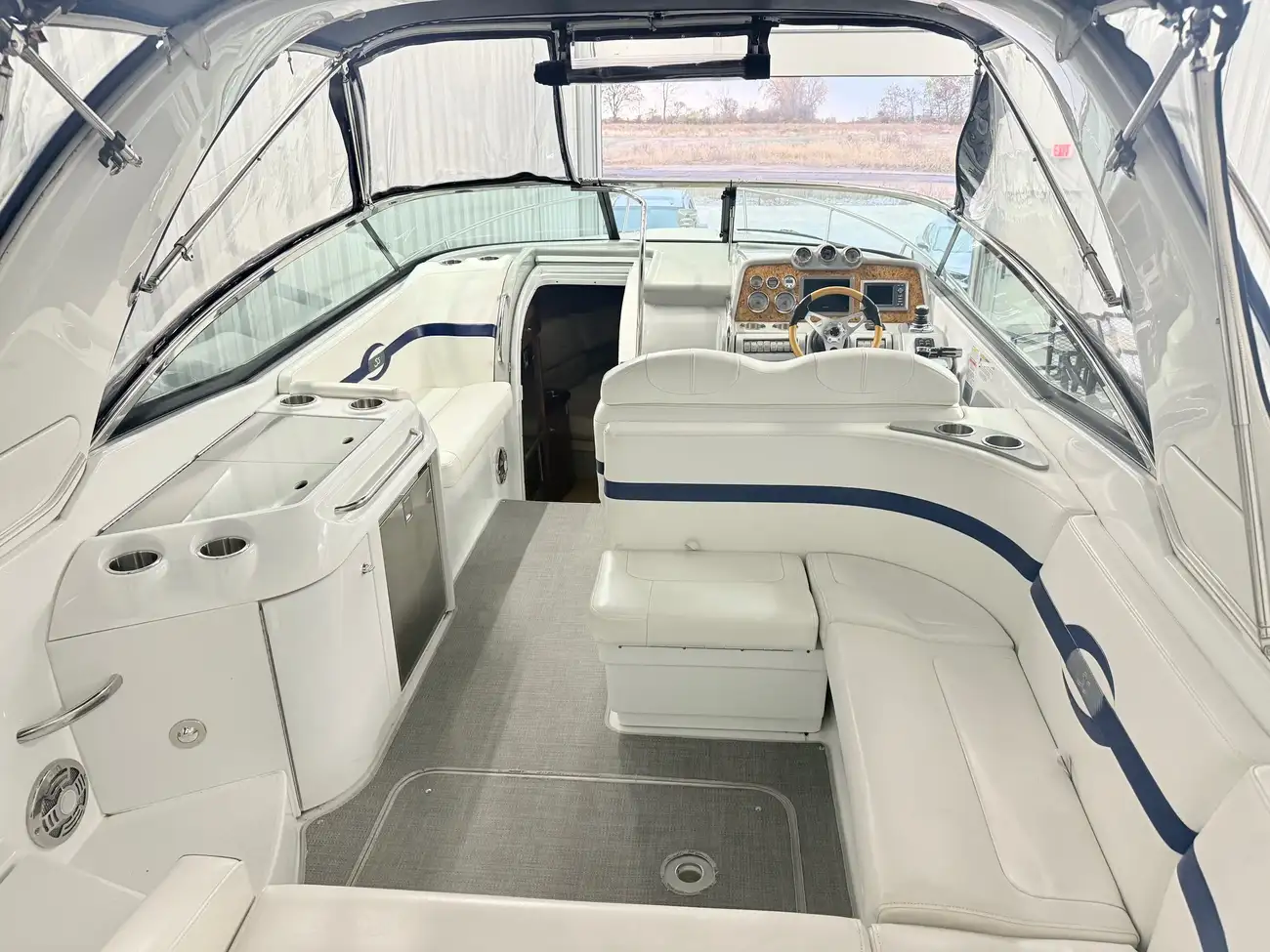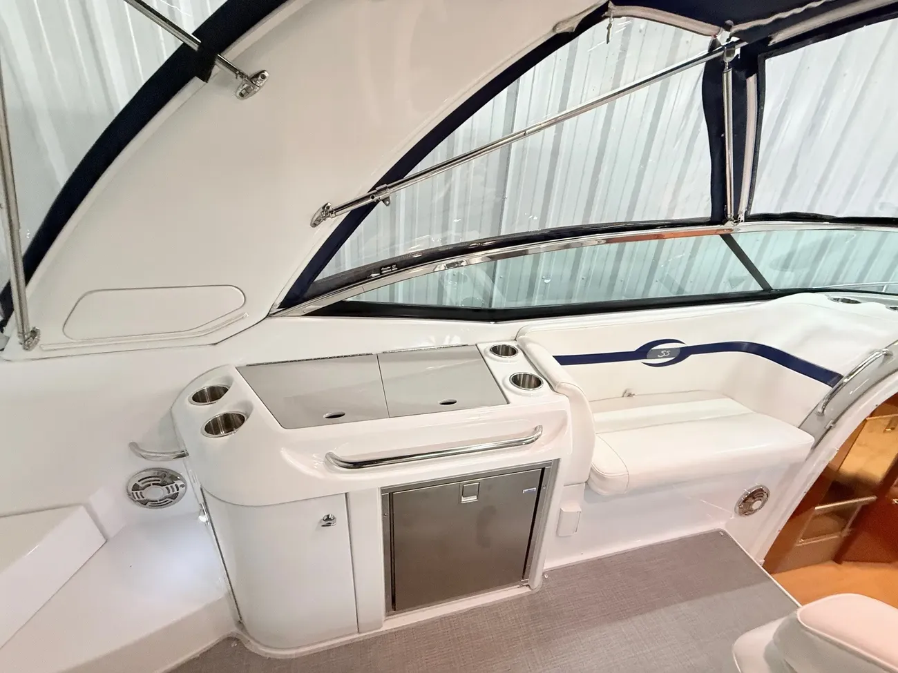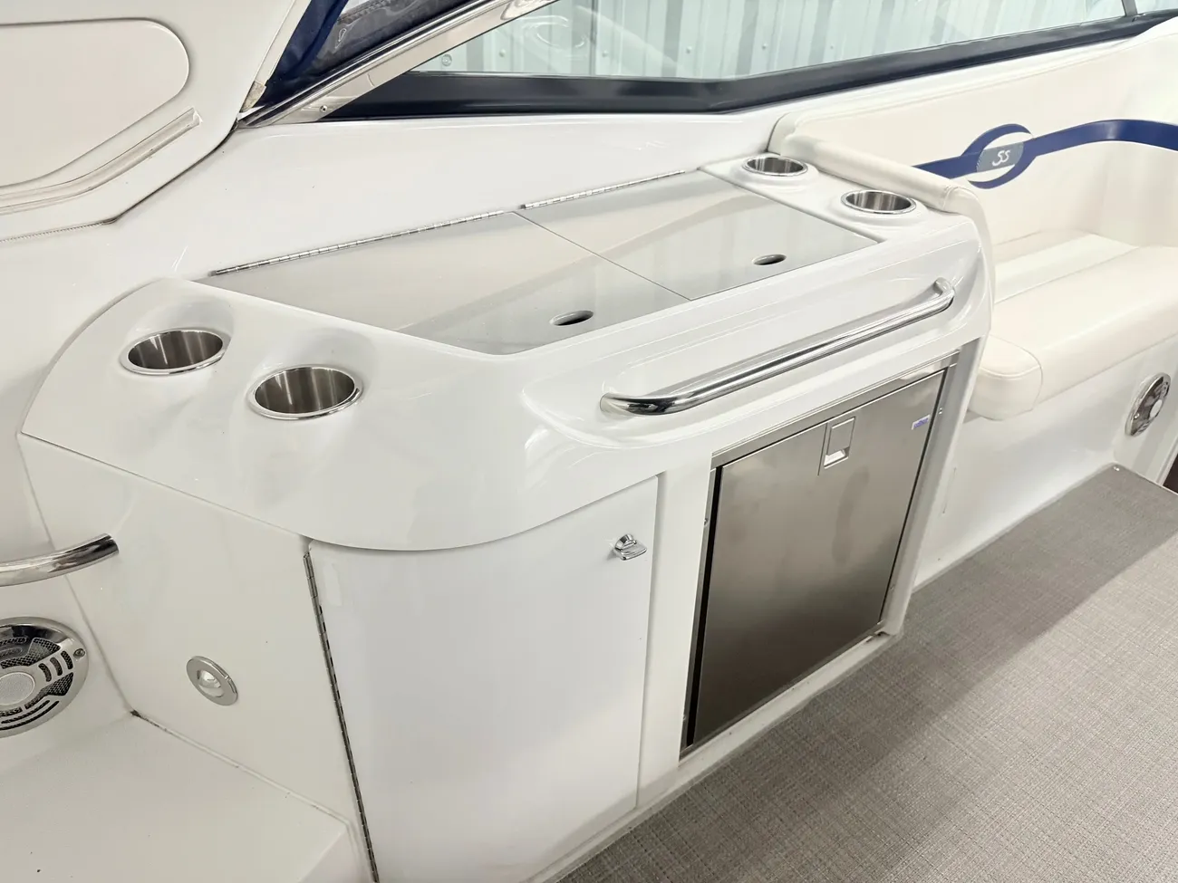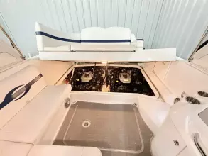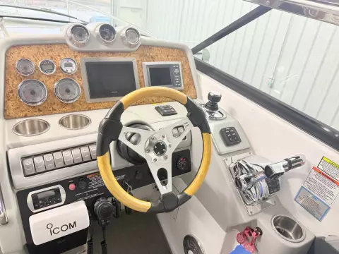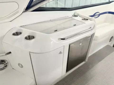 molded wet bar with sink, 36-quart cooler and trash receptacle, Dino tilt steering wheel, transom shower, and an extended swim platform with pull-up cleats. The transom storage trunk is a plus,