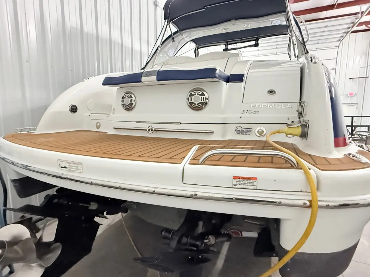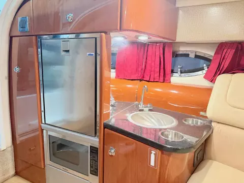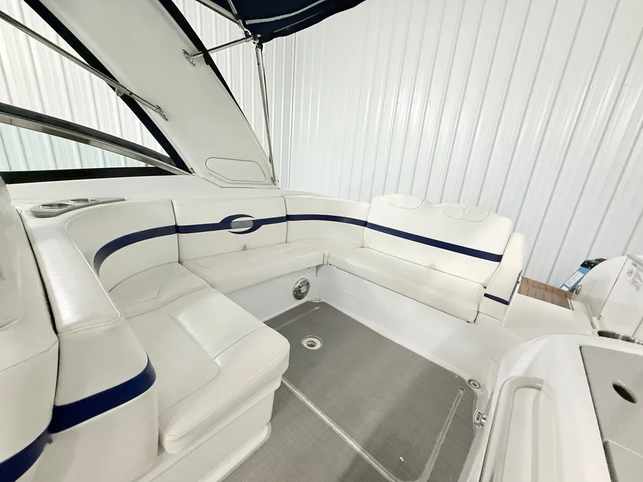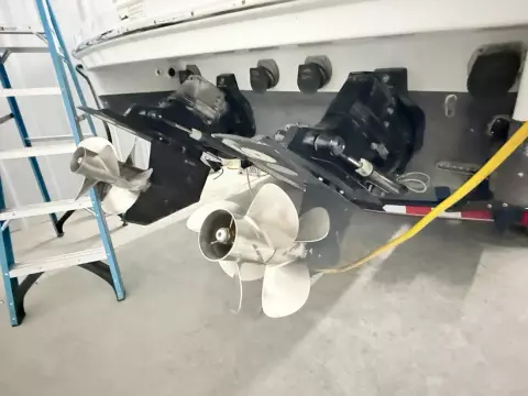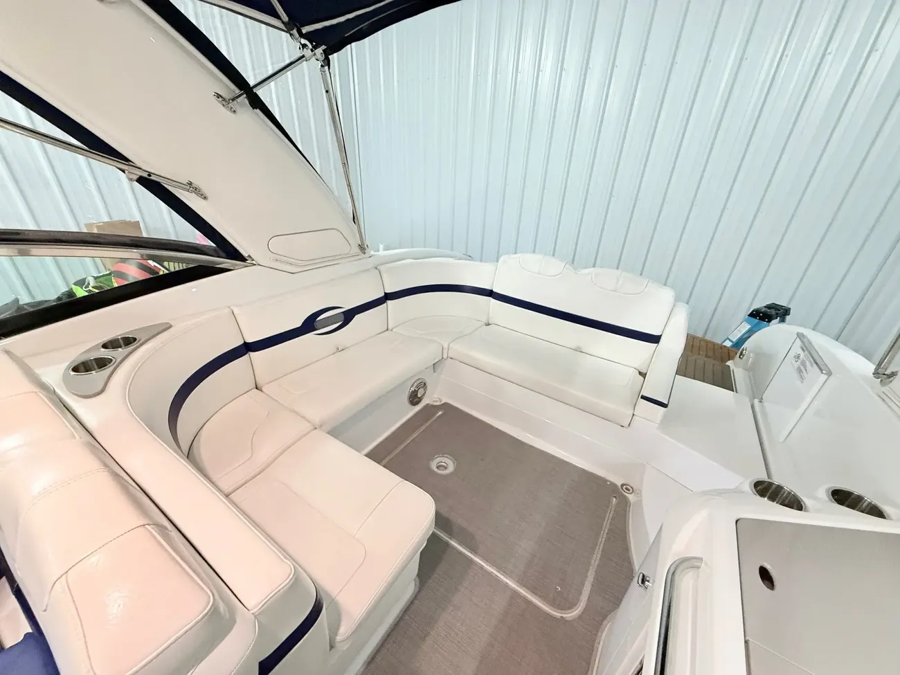 molded wet bar with sink, 36-quart cooler and trash receptacle, Dino tilt steering wheel, transom shower, and an extended swim platform with pull-up cleats. The transom storage trunk is a plus,