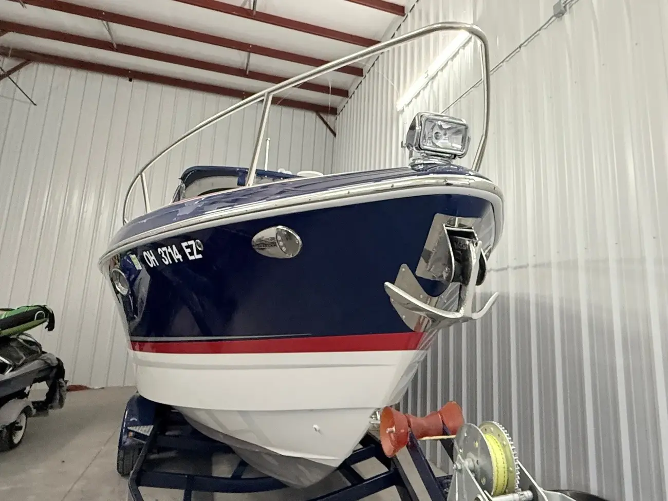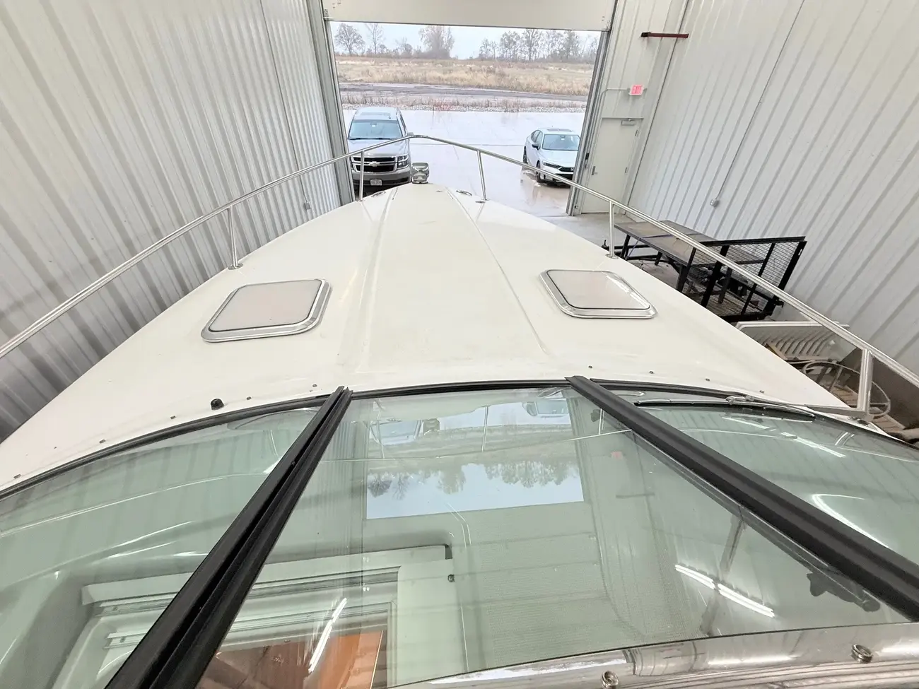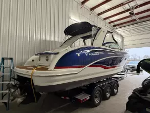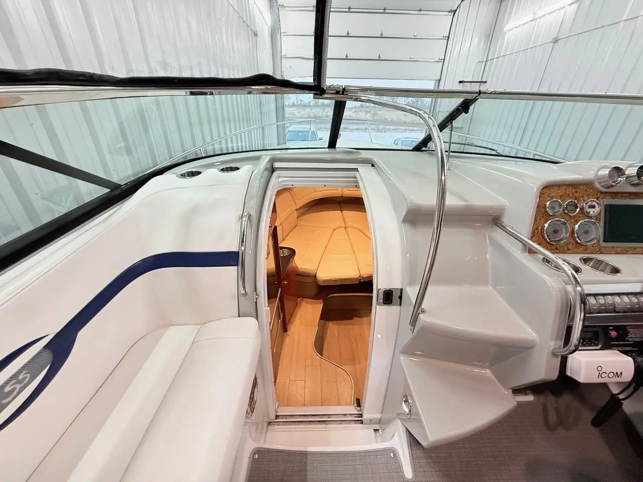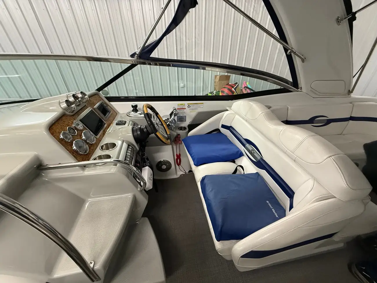 molded wet bar with sink, 36-quart cooler and trash receptacle, Dino tilt steering wheel, transom shower, and an extended swim platform with pull-up cleats. The transom storage trunk is a plus,
