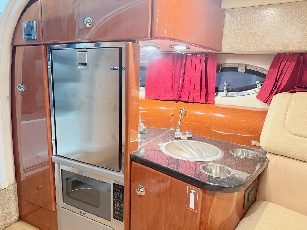 wood tables, and a luxurious Ultraleather lounge. The enclosed head features an electric flush system with stainless steel sink and a pull-out shower. Standard features include a Corian galley counter,