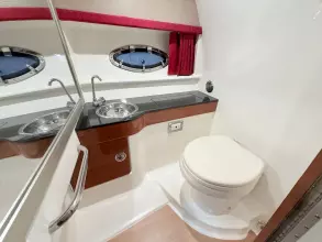 or overnighting, and her spacious cockpit has seating for ten including a clever aft-facing transom lounge that converts into sun pad. In the cabin there are deep cherry wood cabinets, solid