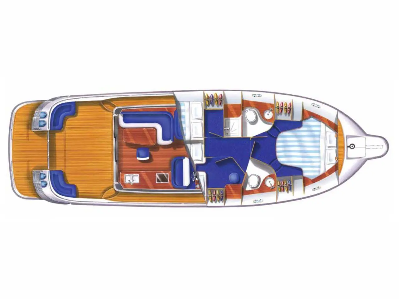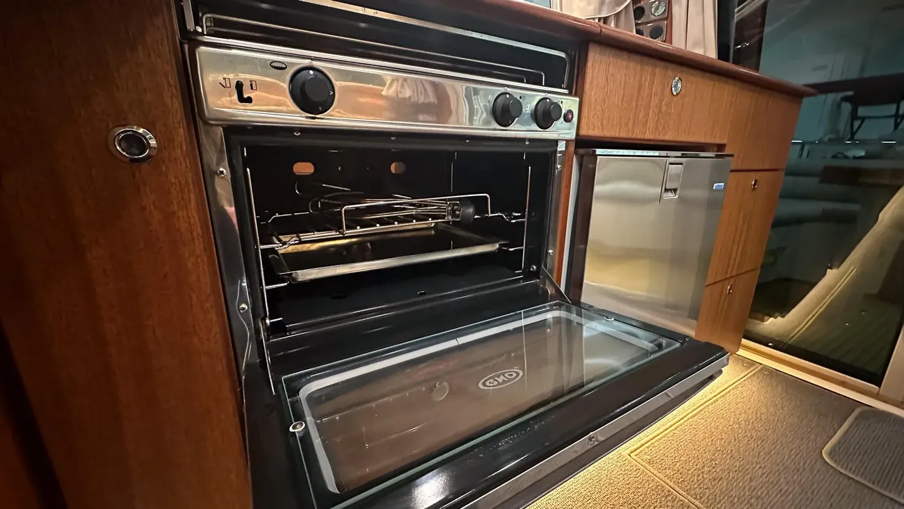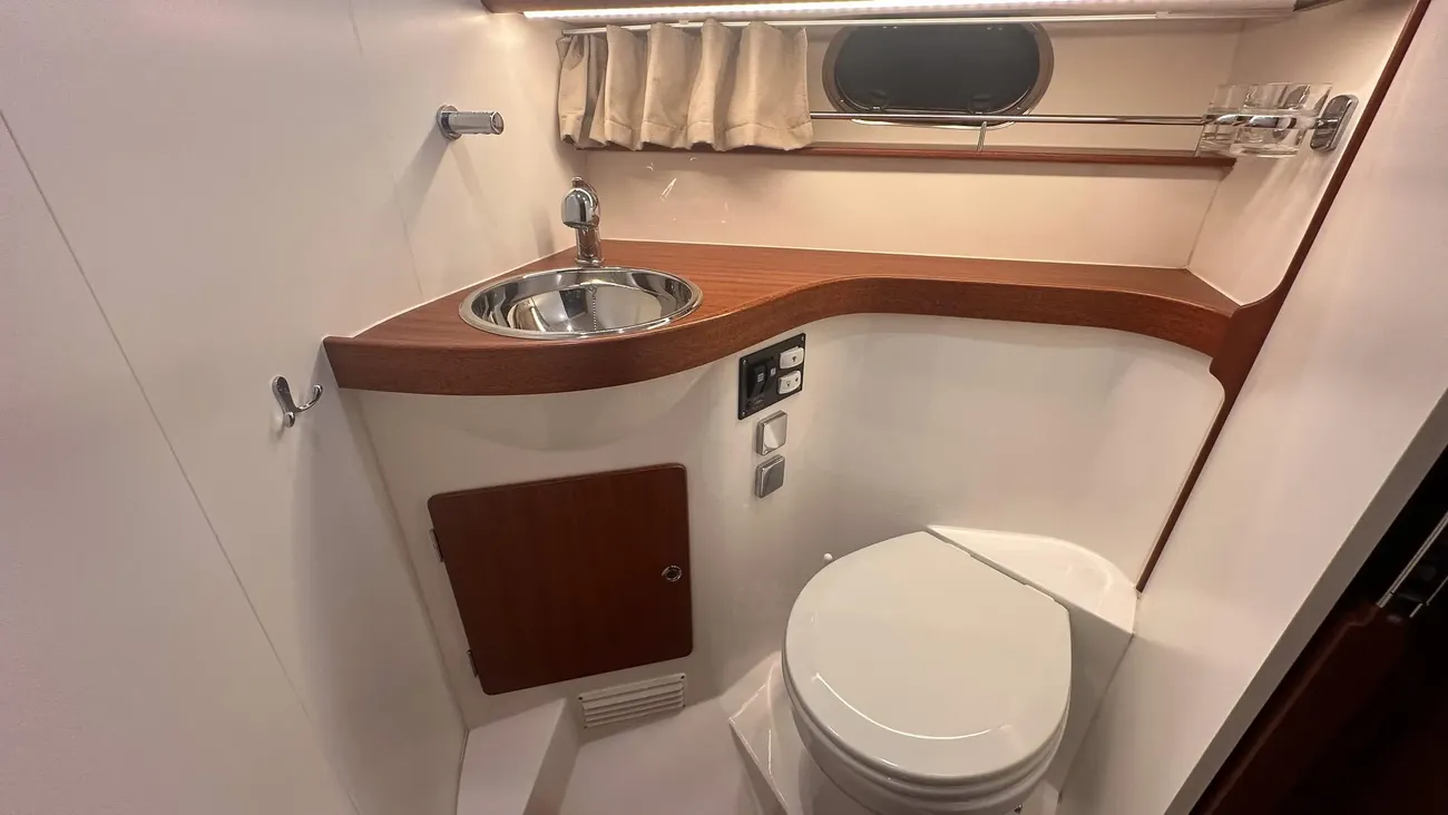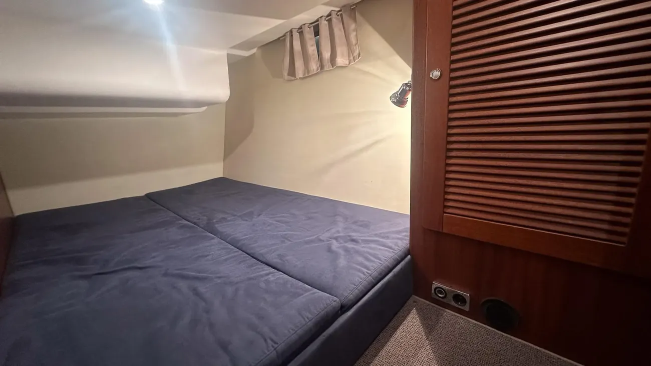 Båten erbjuder tre rymliga dubbelhytter och två toaletter, varav den ena med separat duschkabin– perfekt för längre turer med familj eller vänner.