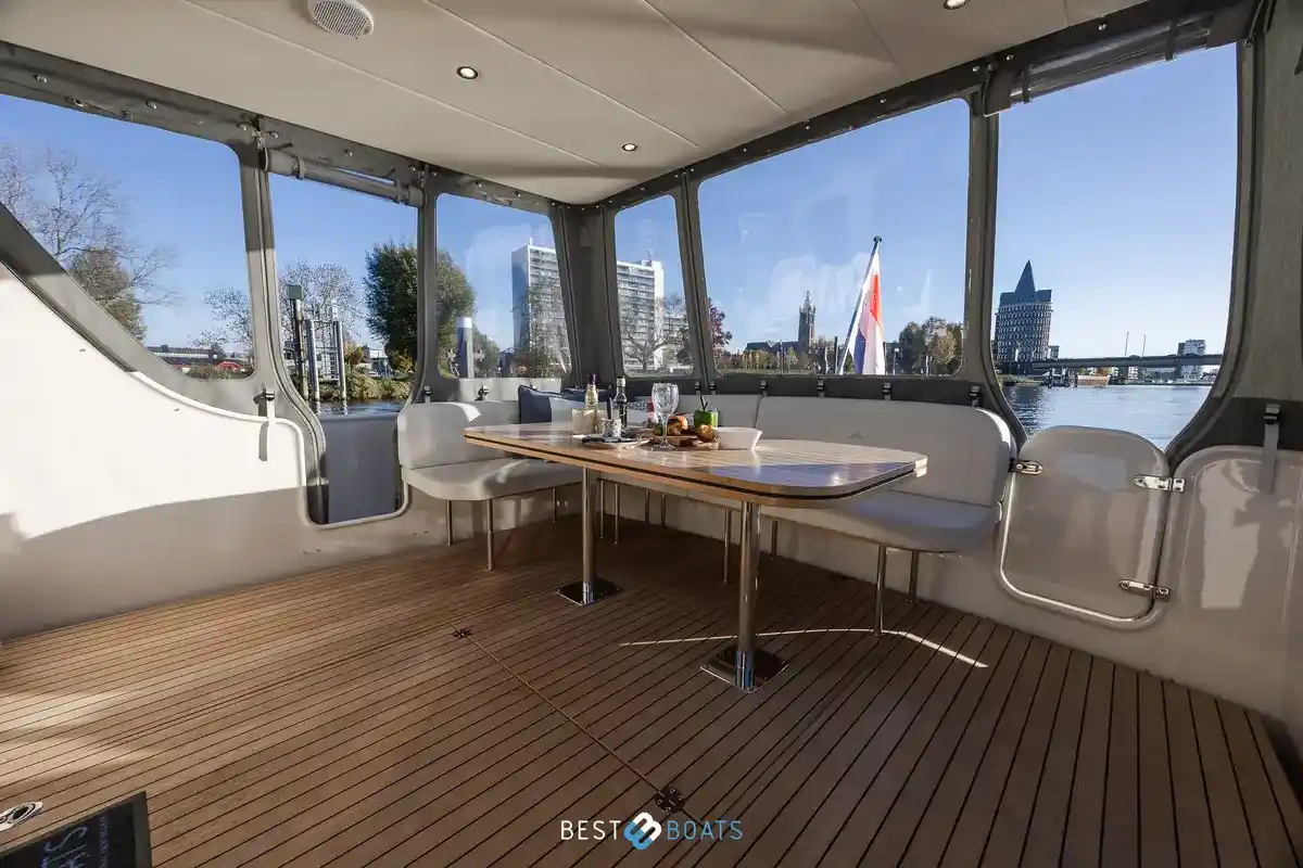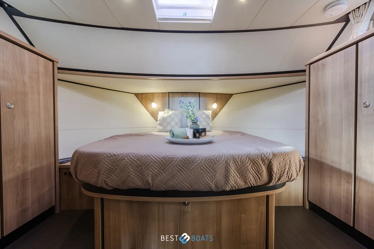 Het interieur straalt luxe en functionaliteit uit, met hoogwaardige materialen zoals okoumé betimmering, wengé onderhoudsvrije vloeren en elegante crème gordijnen. Het watersysteem is volledig uitgerust met een 440 liter watertank en warmwaterinstallatie van 60 liter, terwijl de elektrische installatie met Victron Energy batterijen, lader en omvormer zorgt voor optimale betrouwbaarheid aan boord.