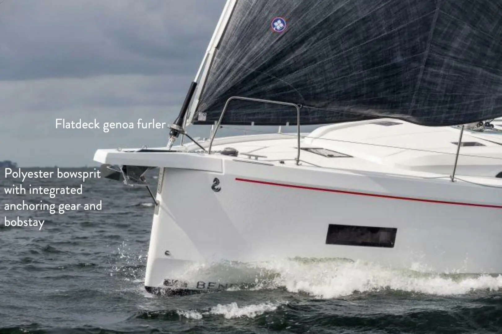 • Polyester bowsprit with integrated anchoring gear and bobstay (for Code 0 and asymmetric spinnaker)
