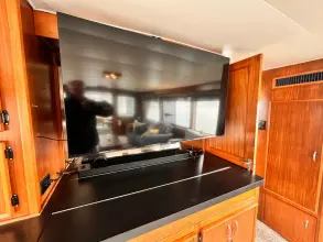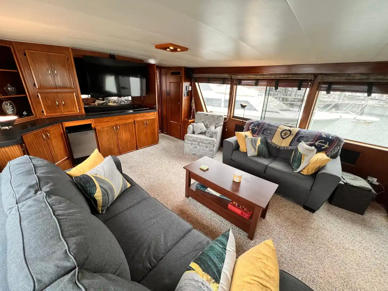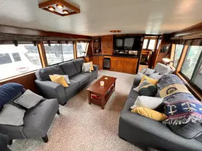 The master aft cabin has a private bath with separate shower on the starboard side and full closet beside the vanity. The master bed is a Craftmatic adjustable bed, and built-in dressers on each side. All beddings and lines are new.