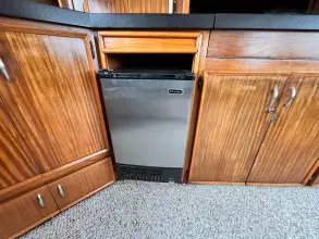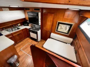 The three staterooms and three heads layout, with galley down across from the dinette is a popular layout. The galley has a cook-top with oven above and a dishwasher below. The new drawer style freezer and fridge are on the opposite side of galley.